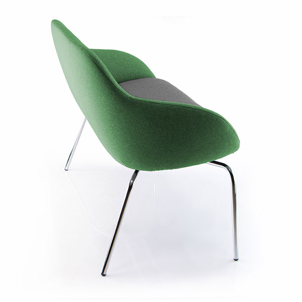 “Cette banquette « vintage » très tendance propose une nouvelle forme de coque avec un dossier plus haut grand confort. 4 piétements au choix et tables basses gigognes assorties.”