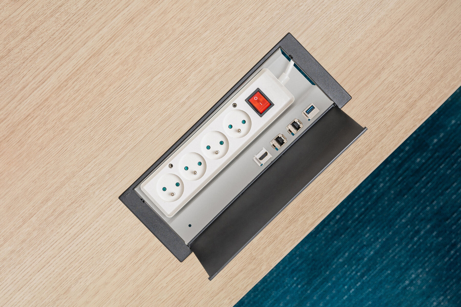 • Médiaboxes intégrées avec prises 230V, ports USB, RJ45 et HDMI