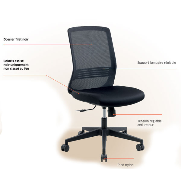 Le fauteuil de bureau Wendy est un siège bureautique synchrone blocable 1 position avant avec une tension réglable anti-retour. Il est équipé d’un dossier filet et d’un support lombaire réglable pour un confort optimal. Disponible en noir uniquement et non classé au feu, ce fauteuil est recommandé pour un travail bureautique et/ou polyvalent avec une utilisation jusqu’à 8 heures par jour et un poids maximum de 90 kg.