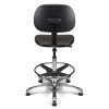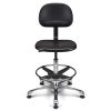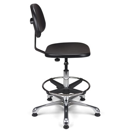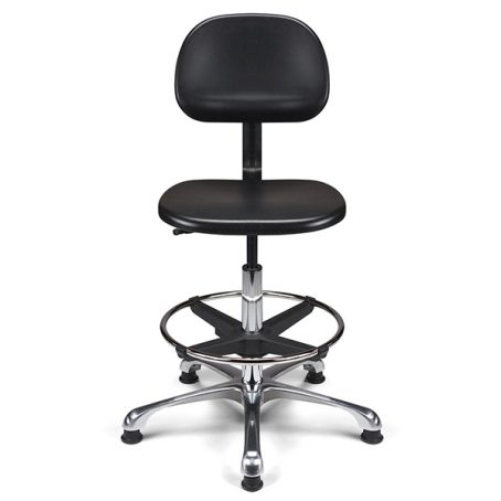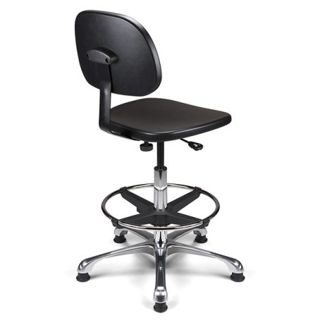 Vérin pneumatique lg 375 mm. Assise & dossier polyuréthane noir haute densité. Liaison assise-dossier par lame acier époxy noir. Repose-pieds acier avec blocage toutes positions par levier de serrage. Base aluminium poli, diam. 640 mm.