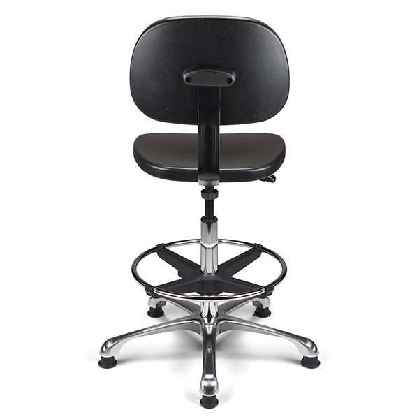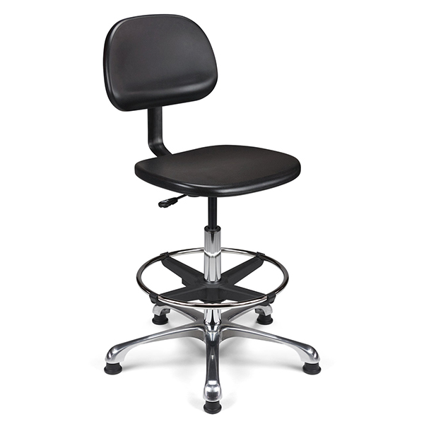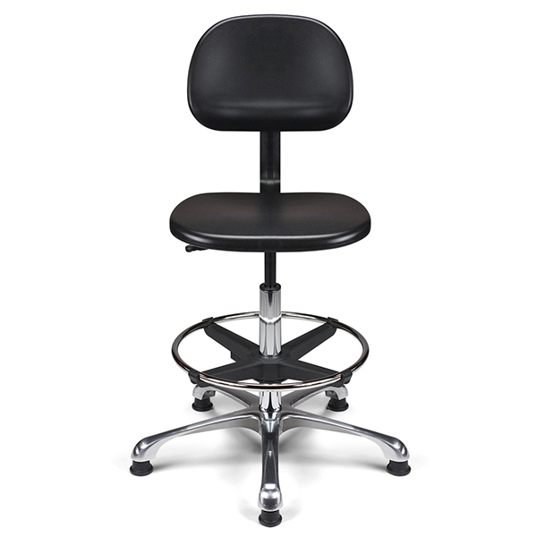 Vérin pneumatique lg 375 mm. Assise & dossier polyuréthane noir haute densité. Liaison assise-dossier par lame acier époxy noir. Repose-pieds acier avec blocage toutes positions par levier de serrage. Base aluminium poli, diam. 640 mm.