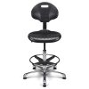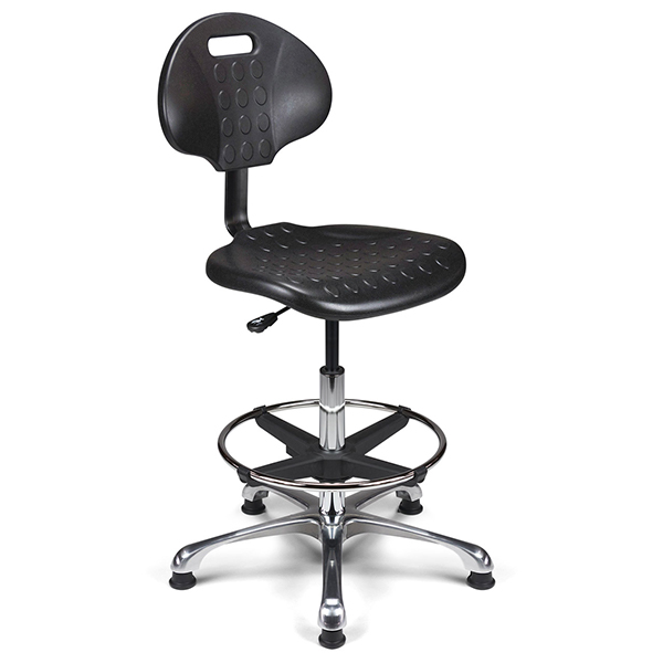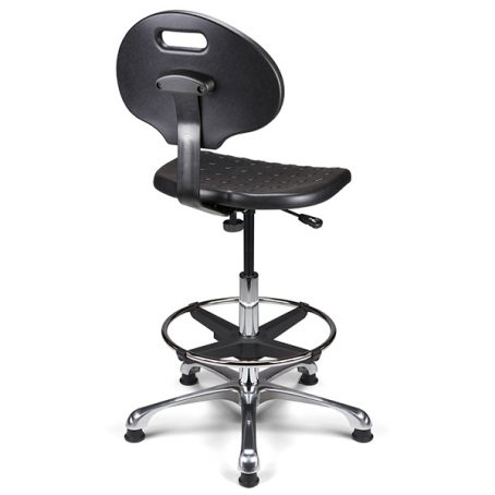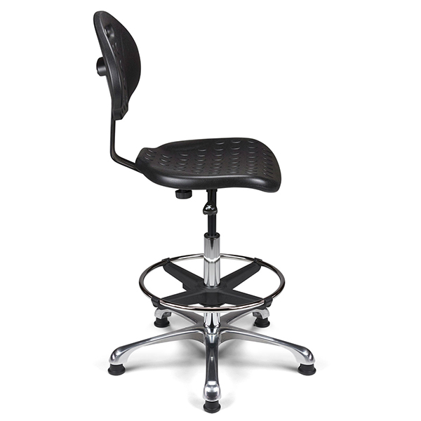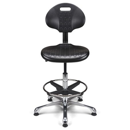 Vérin pneumatique lg 375 mm. Assise & dossier polyuréthane noir haute densité. Liaison assise-dossier par lame acier époxy noir. Repose-pieds acier avec blocage toutes positions par levier de serrage. Base aluminium poli, diam. 640 mm.