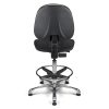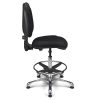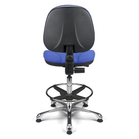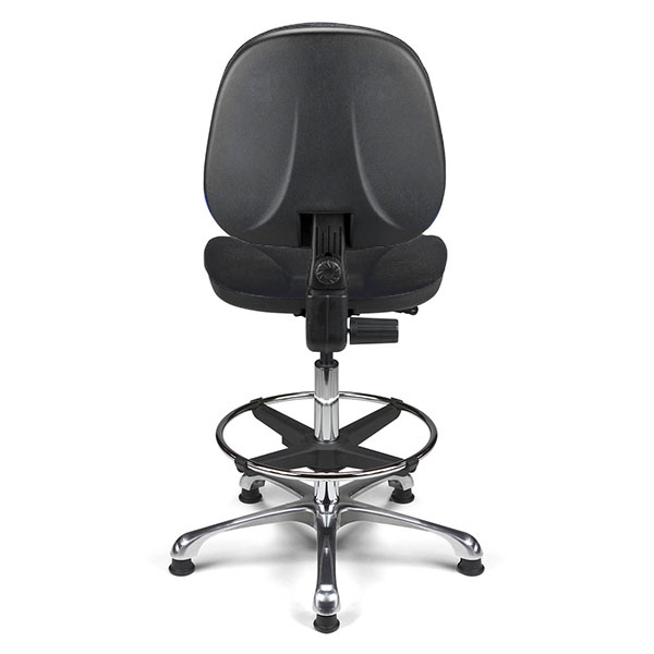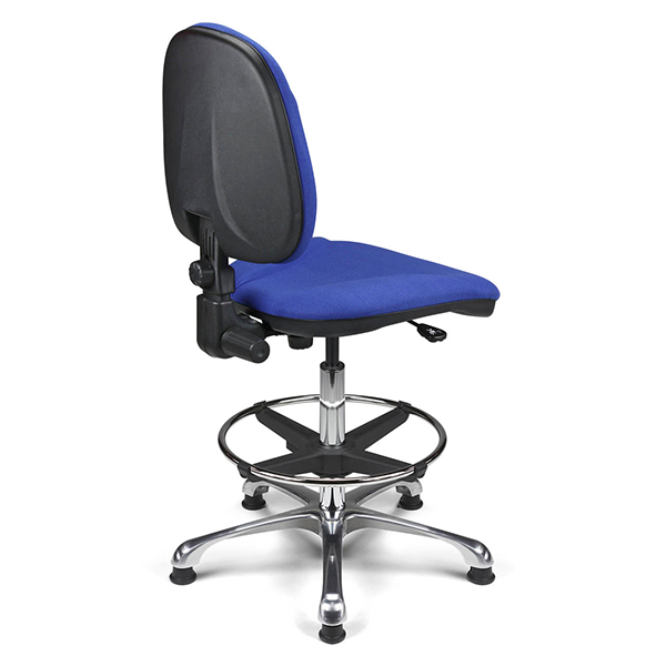 Vérin pneumatique lg 375 mm. Assise & dossier tapissés. Mécanisme à contact permanent. Dossier réglable en hauteur et inclinaison. Repose-pieds acier avec blocage toutes positions par levier de serrage. Base aluminium poli, diam. 640 mm.