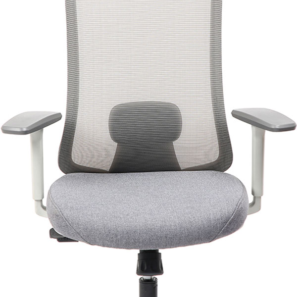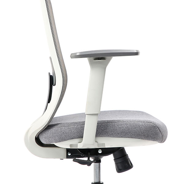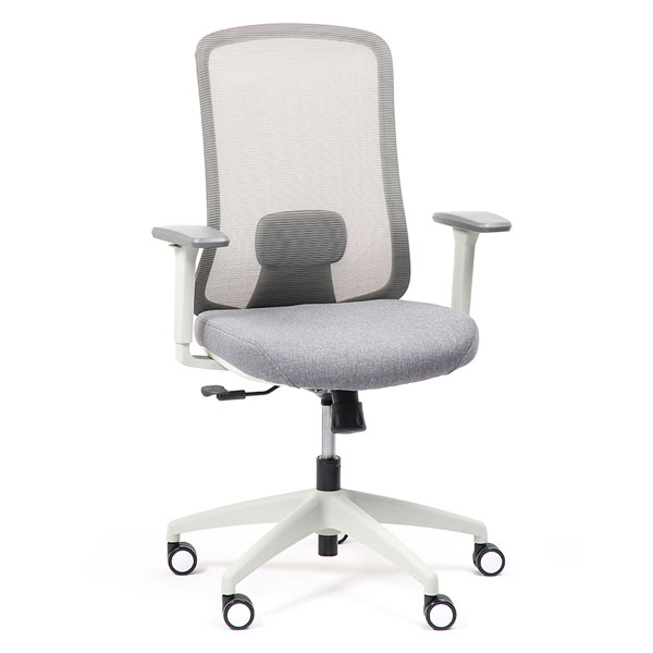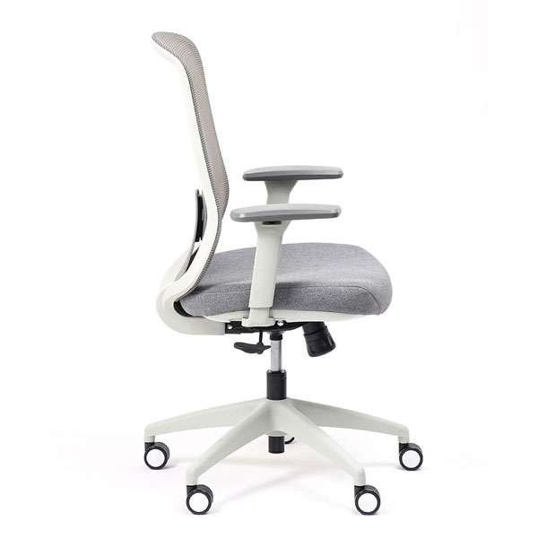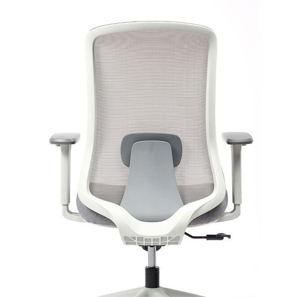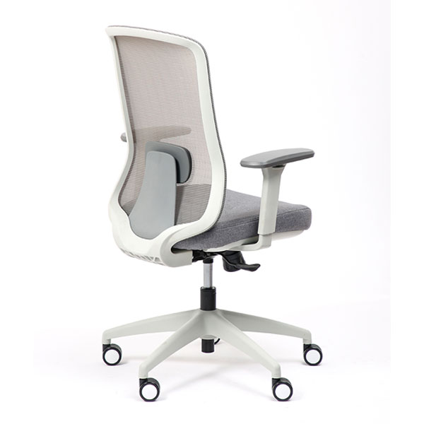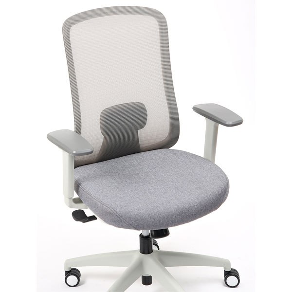 Spécificités :Le dossier est en maille fixée sur un cadre en nylon, avec un soutien lombaire réglable en hauteur. L’assise est en mousse collée sur un support en bois et recouverte de tissu, avec une coque en nylon en dessous. Le mécanisme de basculement est fixé sous l’assise. Le poids total du fauteuil est de 15,6 kg.