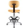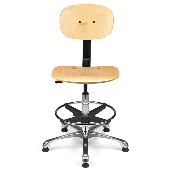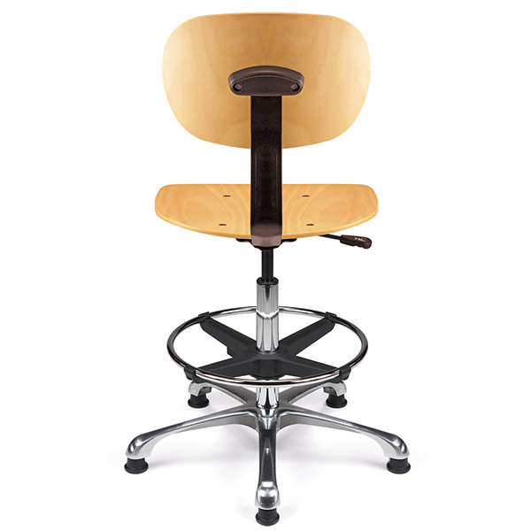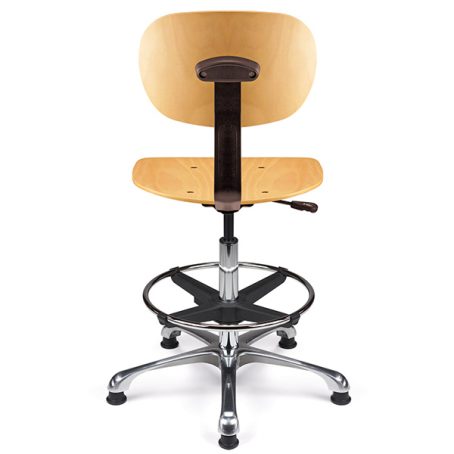 Vérin pneumatique lg 375 mm. Assise & dossier hêtre naturel. Liaison assise-dossier par lame acier époxy noir. Repose-pieds acier avec blocage toutes positions par levier de serrage. Base aluminium poli, diam. 640 mm.