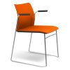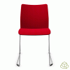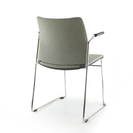 Chaise et fauteuil piètement traîneau. Empilable à la verticale. Structures alu poli, possible avec accoudoirs.