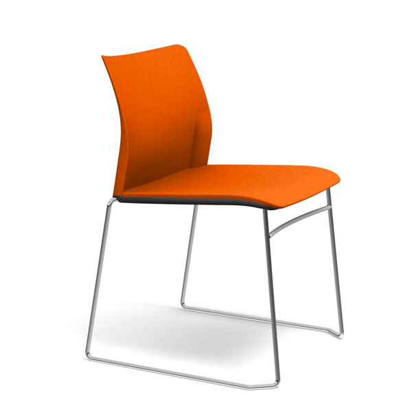 Chaise et fauteuil piètement traîneau. Empilable à la verticale. Structures alu poli, possible avec accoudoirs.