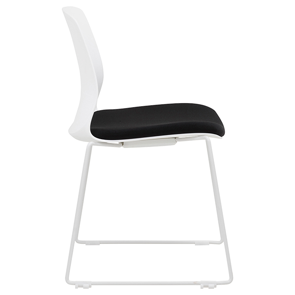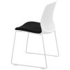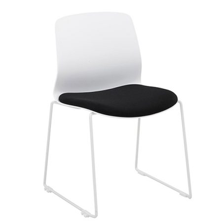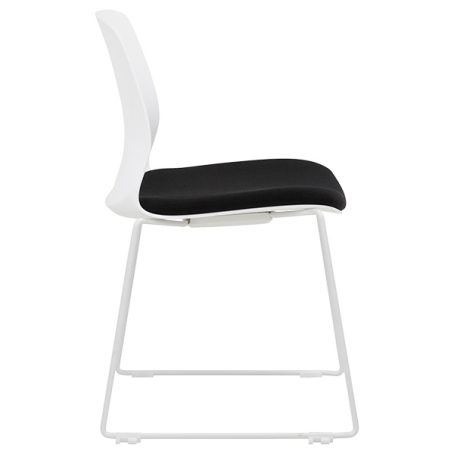 L’assise et le dossier de la chaise sont fabriqués avec une coque en polypropylène renforcée de fibres de verre, offrant une résistance accrue aux chocs et aux rayures. L’assise est recouverte d’un tissu noir, tandis que le dossier est blanc. La mousse haute densité (40 kg/m3) assure un confort d’assise optimal, même pour une utilisation prolongée.