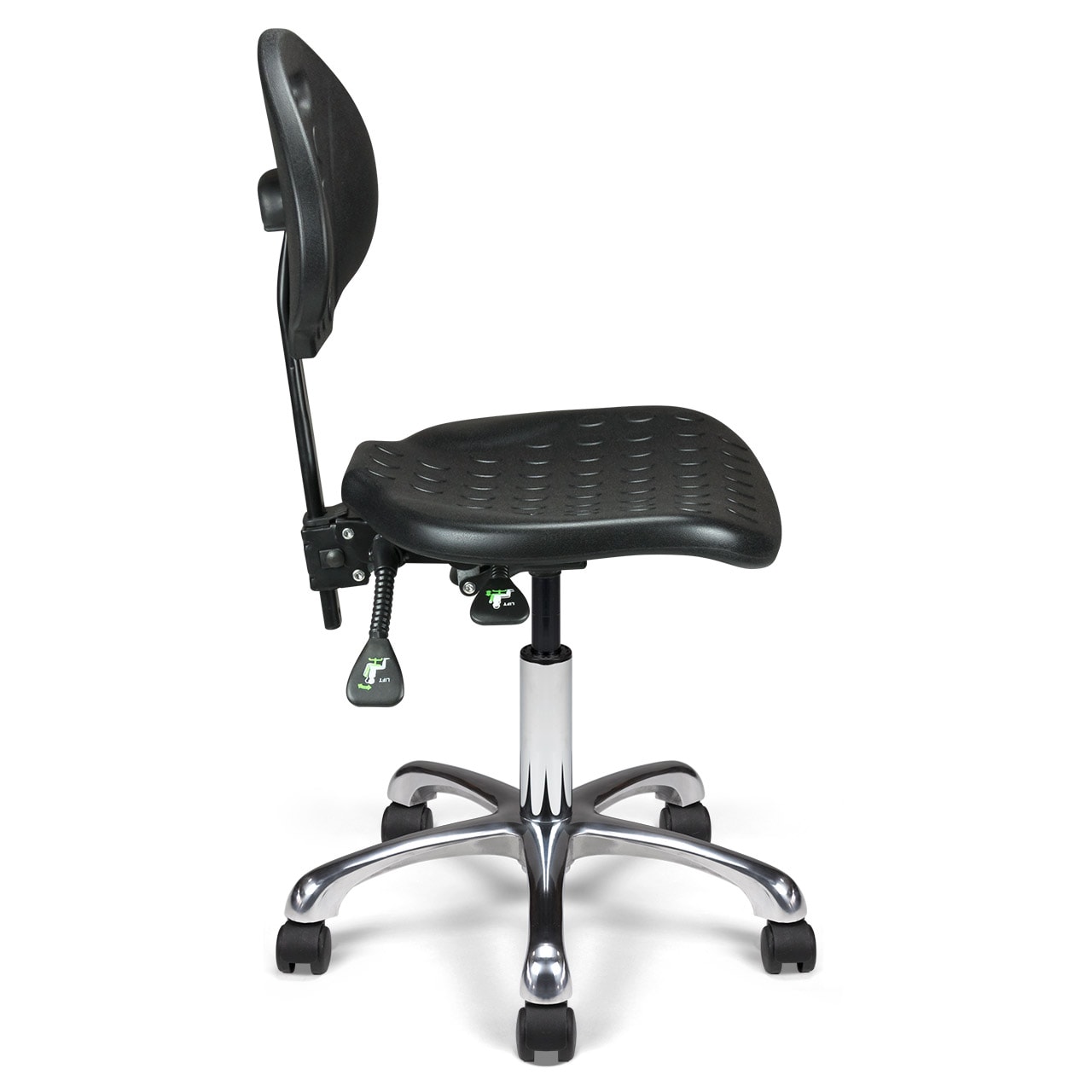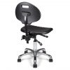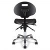 Vérin pneumatique lg 305 mm. Assise & dossier polyuréthane noir haute densité. Mécanisme asynchrone autorisant les réglages différenciés d’inclinaison d’assise et d’inclinaison de dossier. Dossier réglable en hauteur. Base aluminium poli, diam. 640 mm.