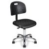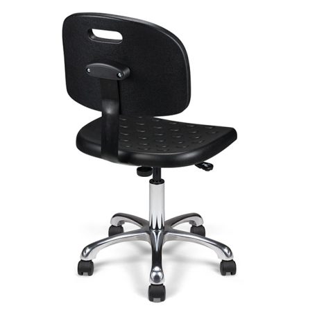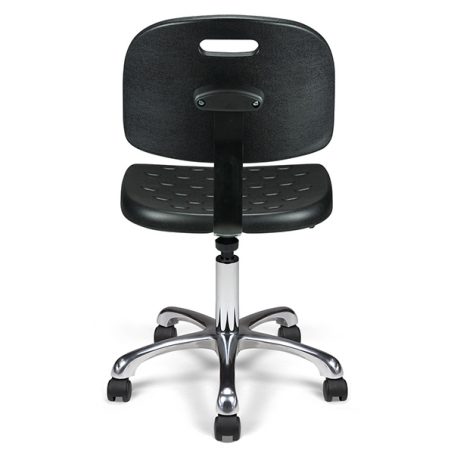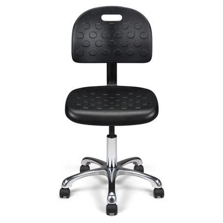 Son assise et son dossier en polyuréthane noir haute densité offrent un excellent confort et une résistance accrue. Le mécanisme de réglage en hauteur de l’assise par levier de commande latéral permet une adaptation personnalisée à chaque utilisateur.
