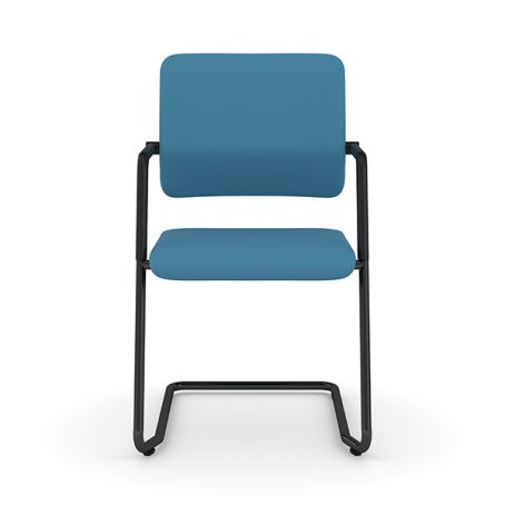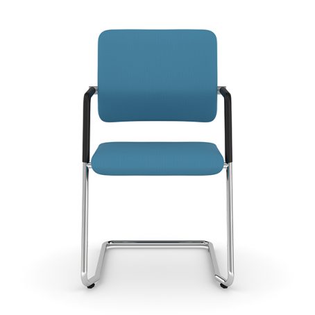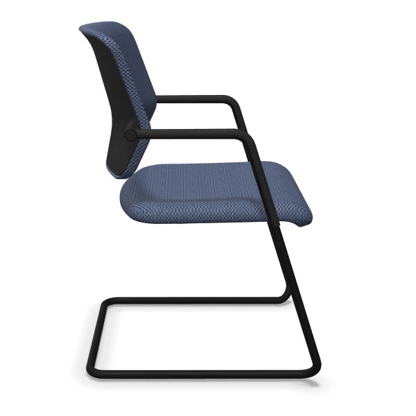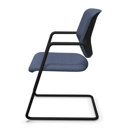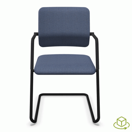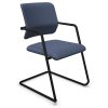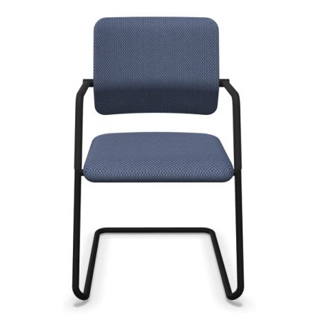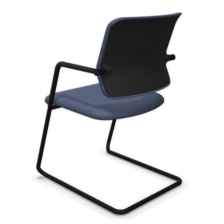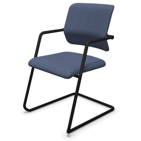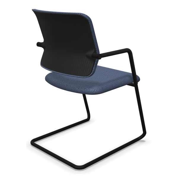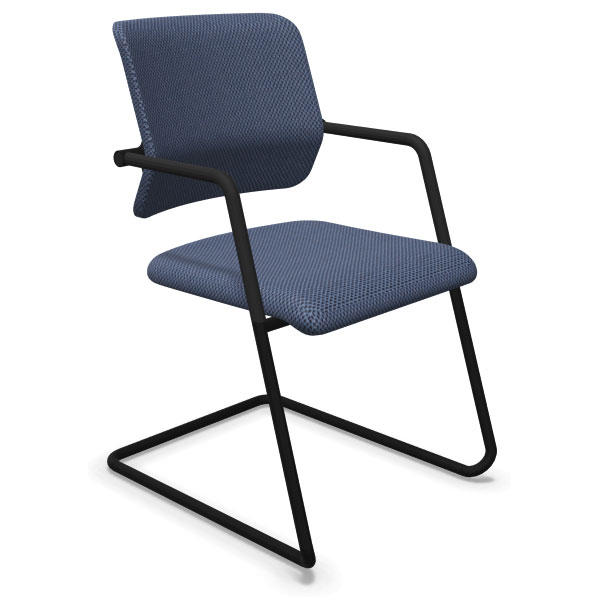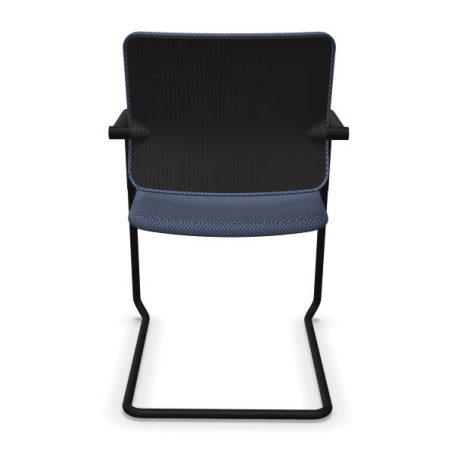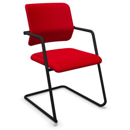 Structure piétement luge en tube d’acier rond, Ø 22 mm. Contre-coque de l’assise et du dossier en polyamide. Assise capitonnée en mousse de polyuréthane haute résilience, dossier en maille tendue sur coque sans mousse. Accoudoirs avec manchettes en PP noires.