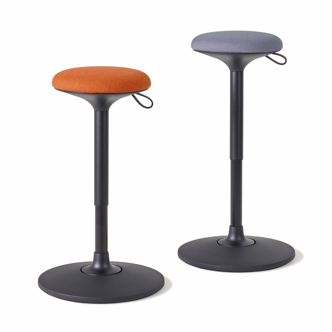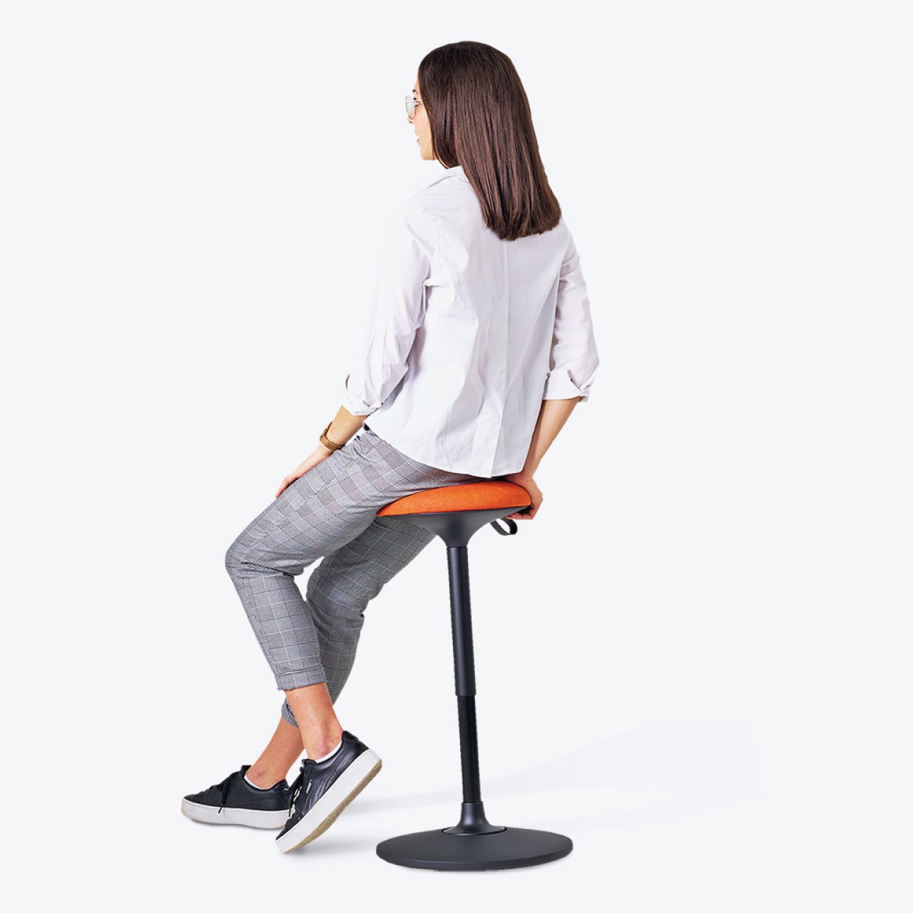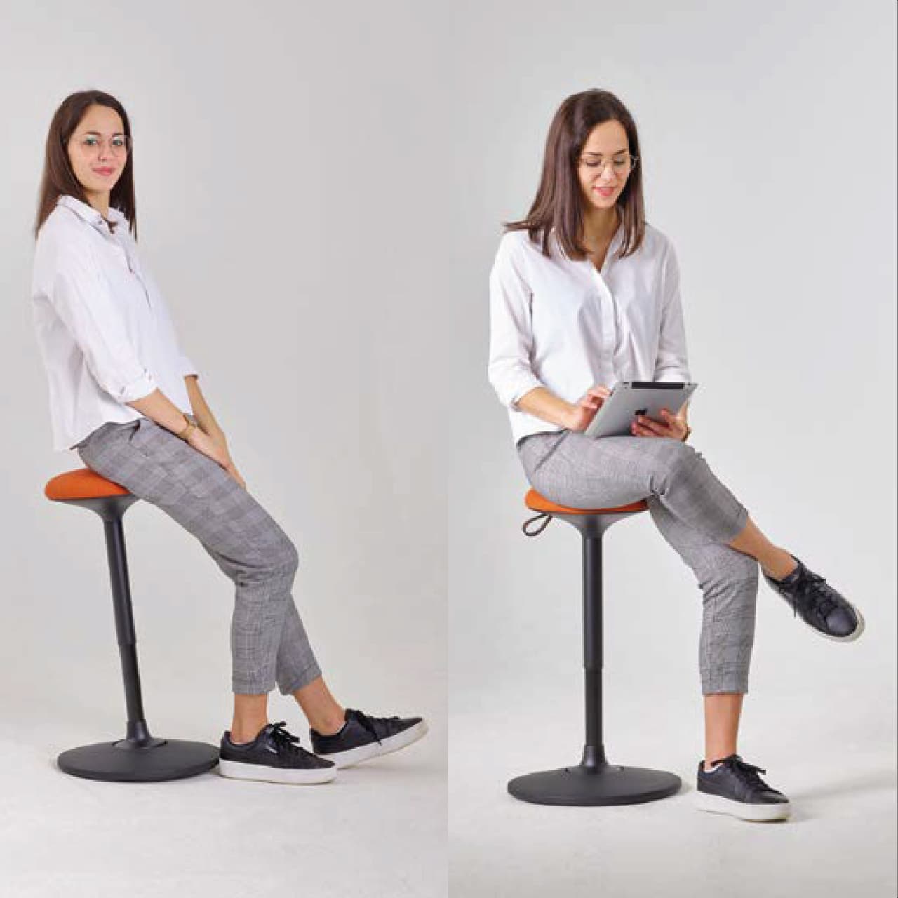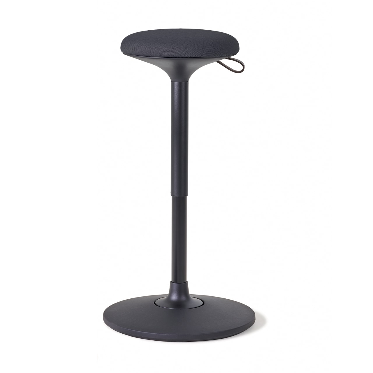 Le tabouret assis-debout est constitué d’une assise garnie de mousse en polyuréthane à mémoire de forme, d’un vérin pneumatique réglable en hauteur via une dragonne en cuir, et d’une embase stable pleine.