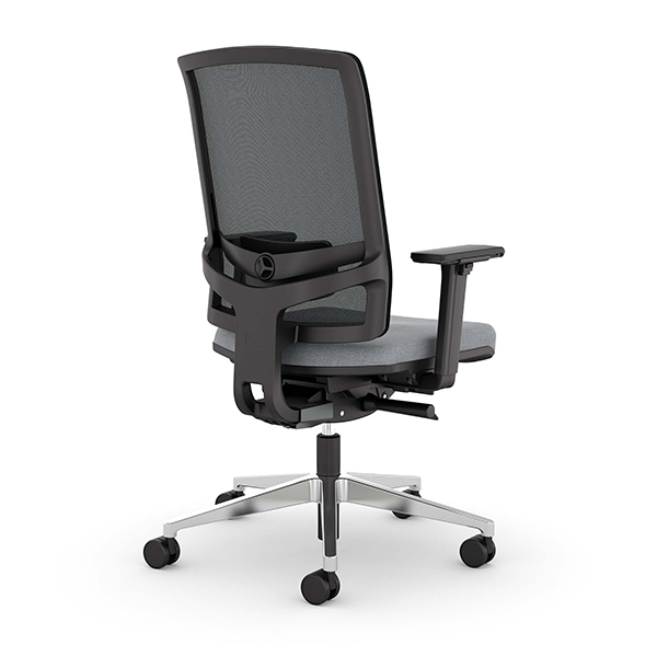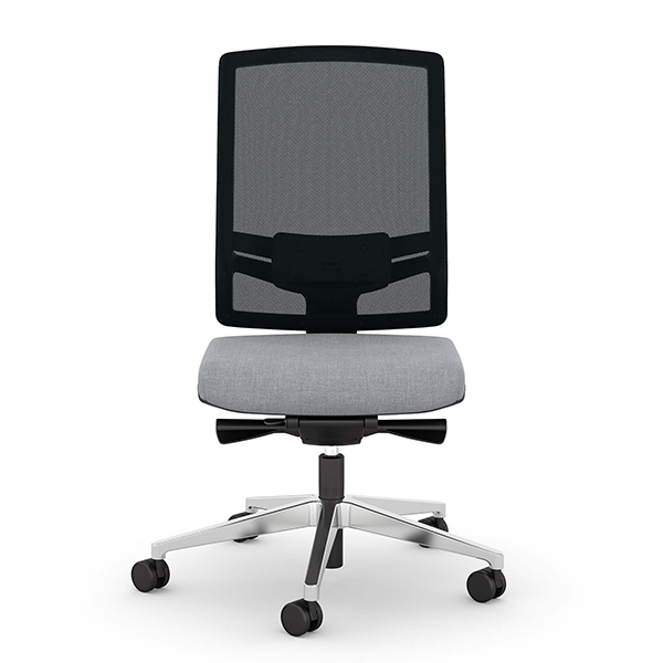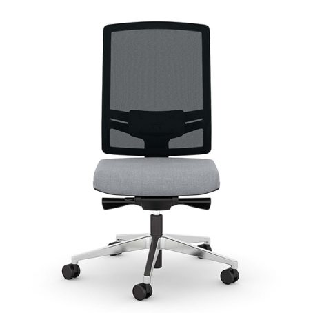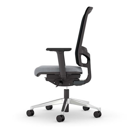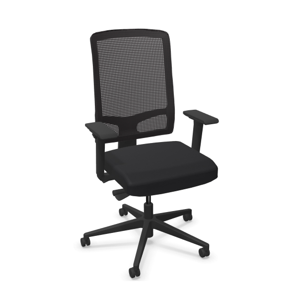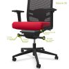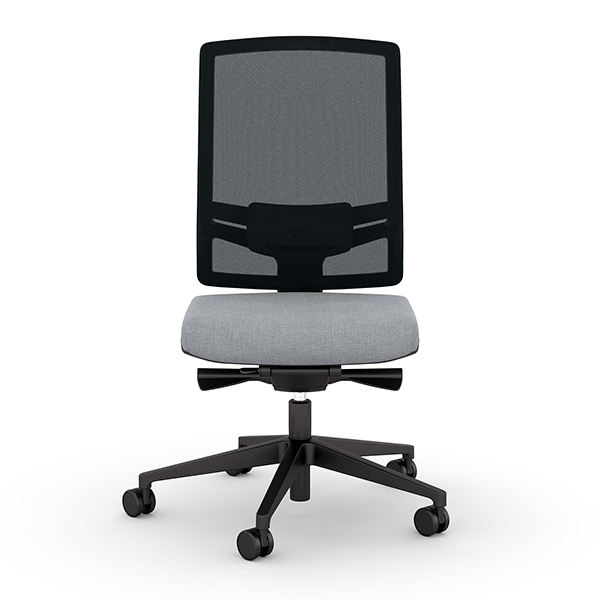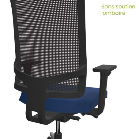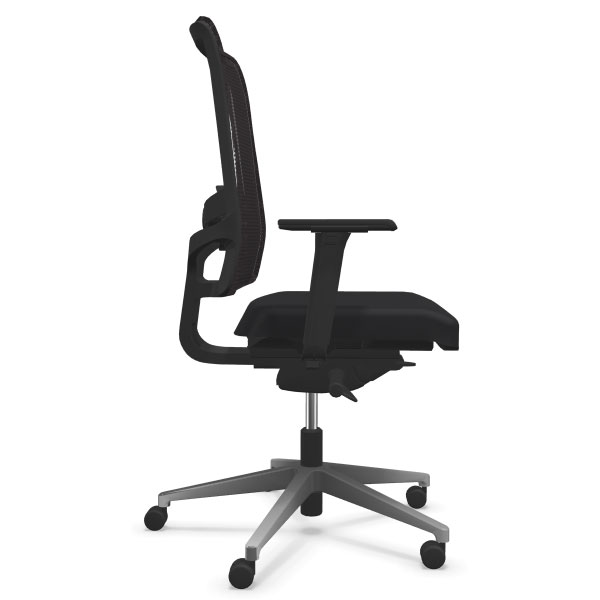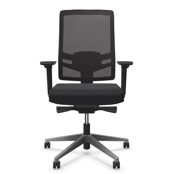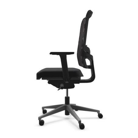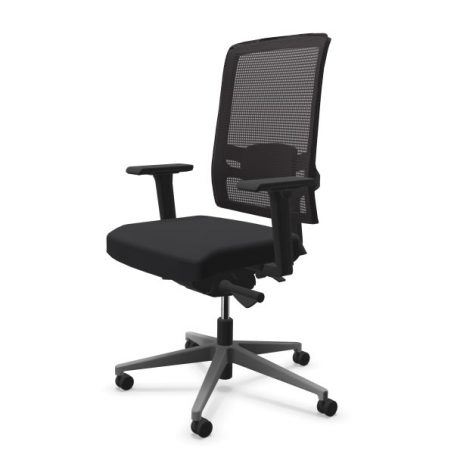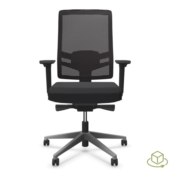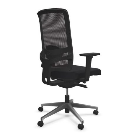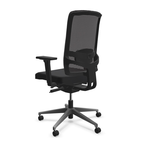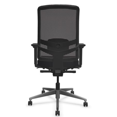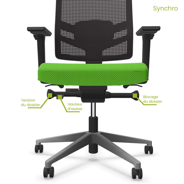 Mécanisme synchrone 4 positions de blocage avec effet anti-retour. Réglage rapide du mouvement synchrone. Translation d’assise 70 mm. Réglage de la hauteur d’assise par vérin pneumatique de sécurité à emboitage conique. Contre-coque de l’assise en polypropylène. Assise en mousse de polyuréthane haute résilience. Dossier en maille tendue thermoactive noire. Tissus tendus non collés. Piétement en composite fibre de verre équipé de roulettes à double galets auto-freinées pour sol souple selon la norme EN 12529. Composants métalliques, polyamide et polypropylène noirs.