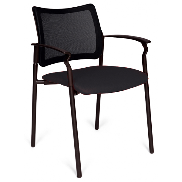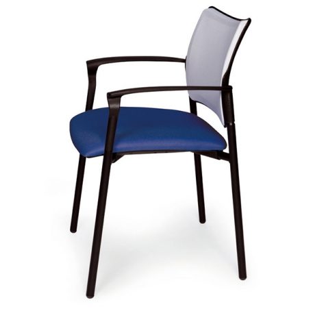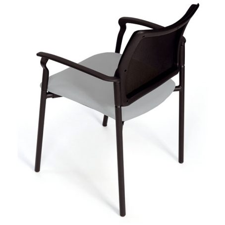 Fauteuil 4 pieds avec accoudoirs structure acier époxy noir – empilable. Assise tapissée tissu – dossier résille.