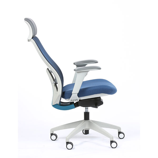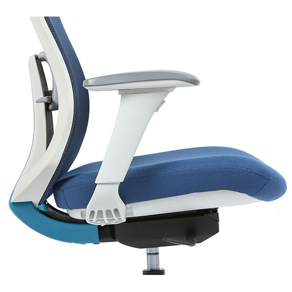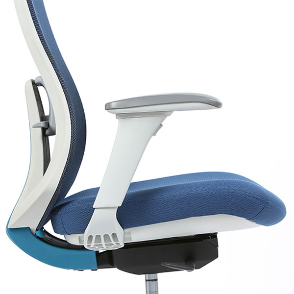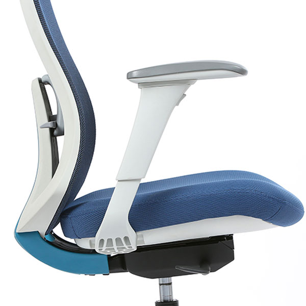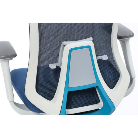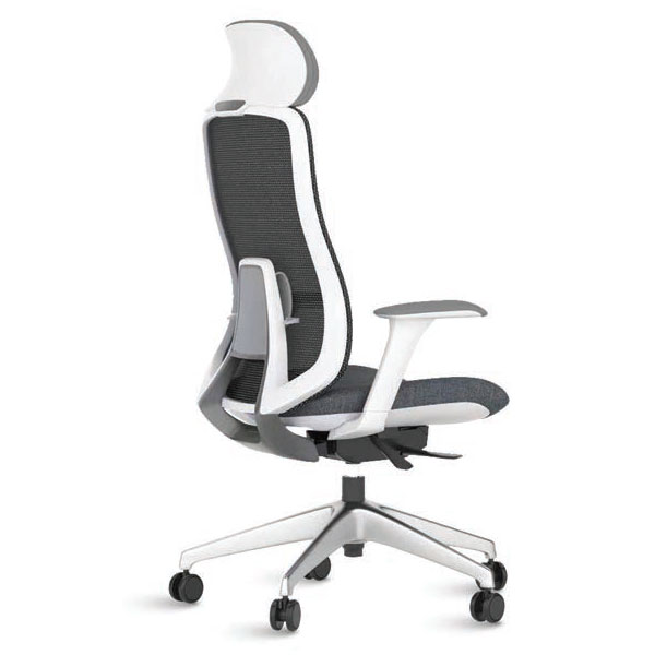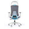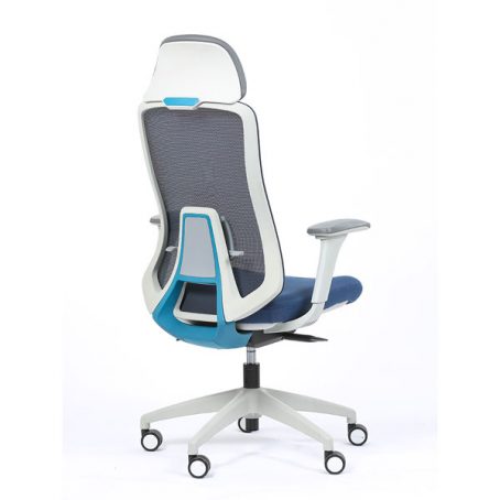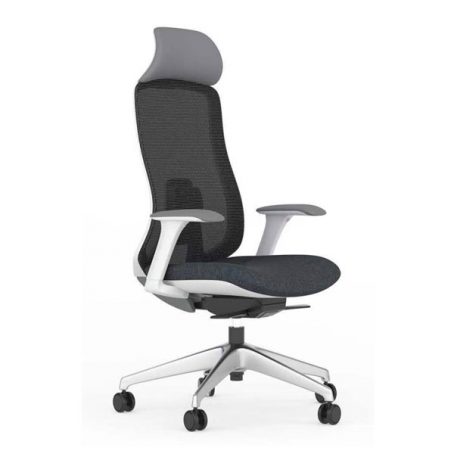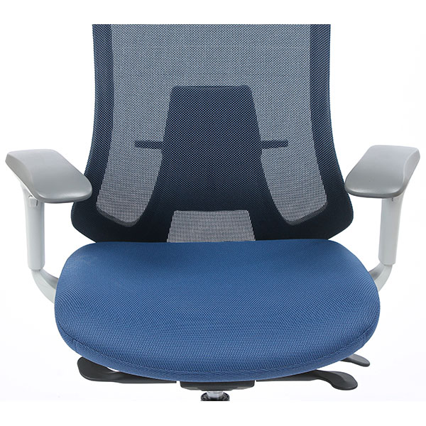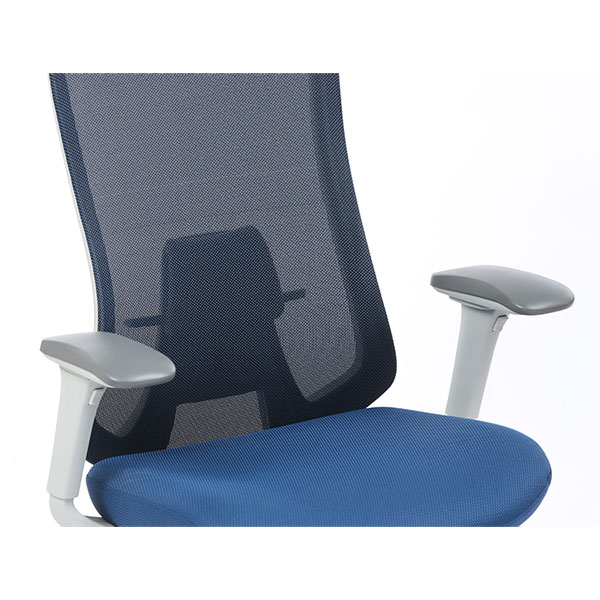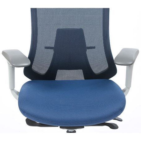 Fauteuil synchrone en maille et tissu, accoudoirs 4D, soutien lombaire et appuit-ête réglables en hauteur, translation d’assise.