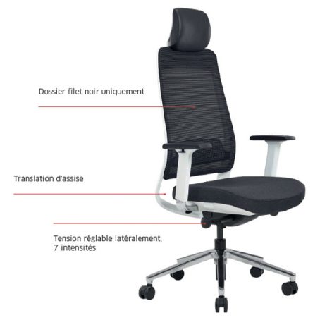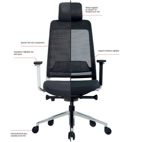 Le fauteuil Fairfax blanc dispose d’un mécanisme synchrone Donati, blocable sur 5 positions avec système anti-retour et réglable en 7 intensités différentes suivant le poids de l’utilisateur. Vous pouvez également régler la hauteur de l’assise par vérin à gaz autoporteur, classe 4, ainsi que la profondeur de l’assise par système coulissant à ressort. Les accoudoirs sont réglables en hauteur, en profondeur et en largeur pour un confort optimal, tandis que la têtière est réglable en hauteur et en imitation cuir noir de 17 cm.