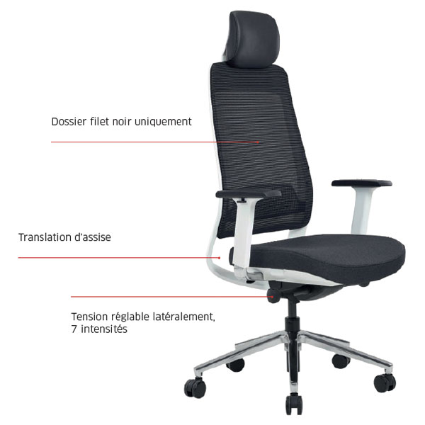 Le fauteuil Fairfax blanc dispose d’un mécanisme synchrone Donati, blocable sur 5 positions avec système anti-retour et réglable en 7 intensités différentes suivant le poids de l’utilisateur. Vous pouvez également régler la hauteur de l’assise par vérin à gaz autoporteur, classe 4, ainsi que la profondeur de l’assise par système coulissant à ressort. Les accoudoirs sont réglables en hauteur, en profondeur et en largeur pour un confort optimal, tandis que la têtière est réglable en hauteur et en imitation cuir noir de 17 cm.