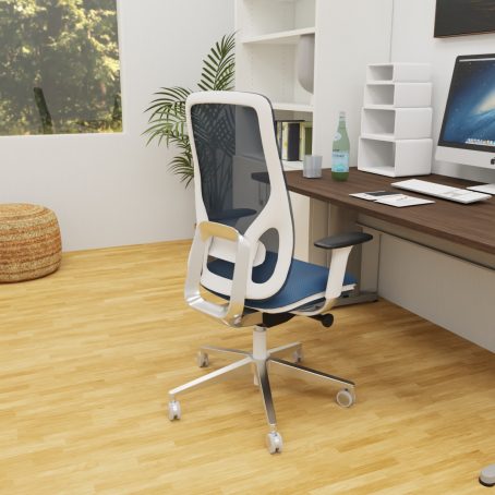 L’assise large et galbée est tapissée en série, offrant un confort d’accueil moelleux et durable. Le dossier en résille de haute qualité garantit une ventilation constante, évitant l’accumulation de chaleur. La lame assise-dossier et la base étoile à 5 branches sont en aluminium poli, conférant au fauteuil une robustesse exceptionnelle et une esthétique raffinée. Les roulettes de diamètre 65 mm sont conçues pour les sols durs, assurant une mobilité fluide et silencieuse.