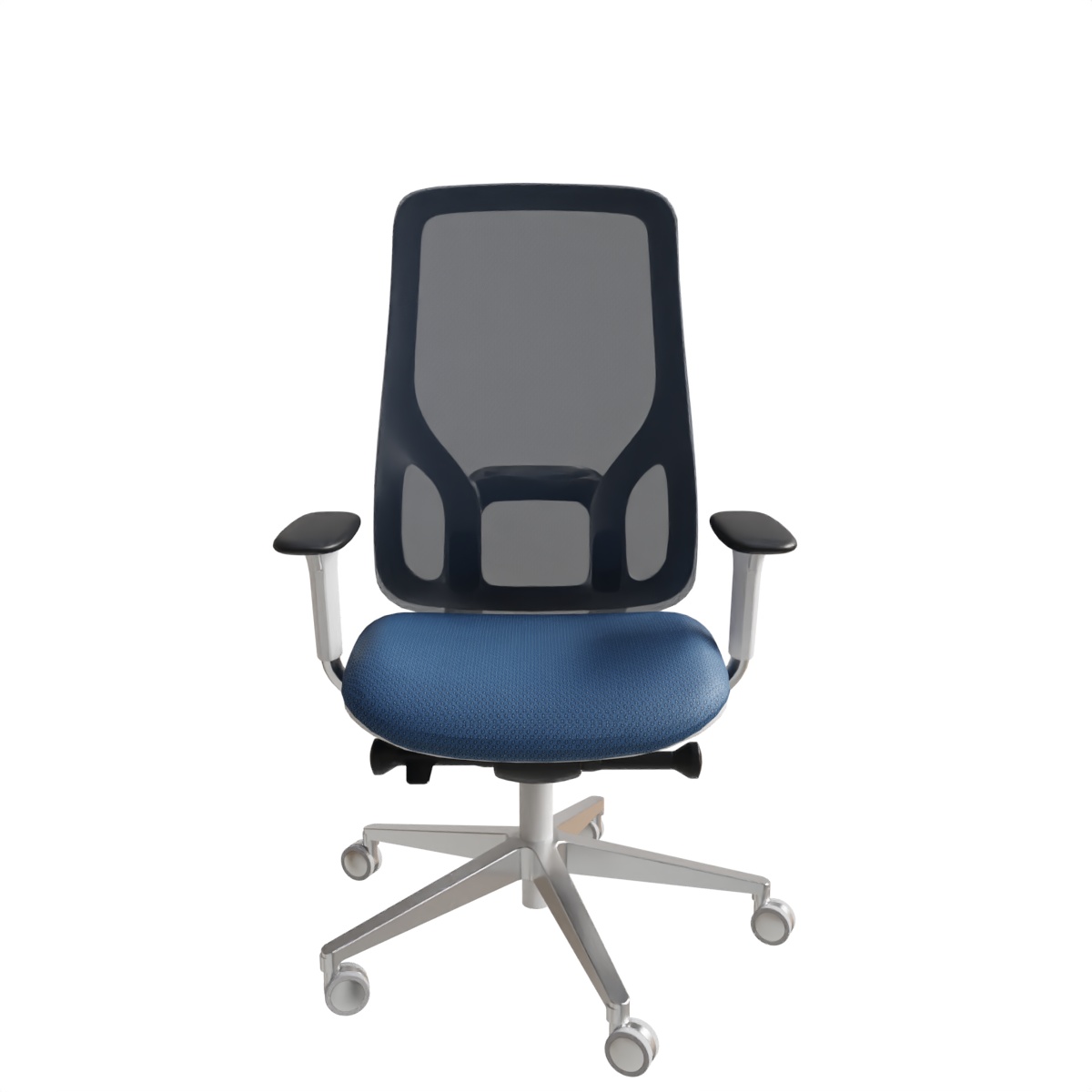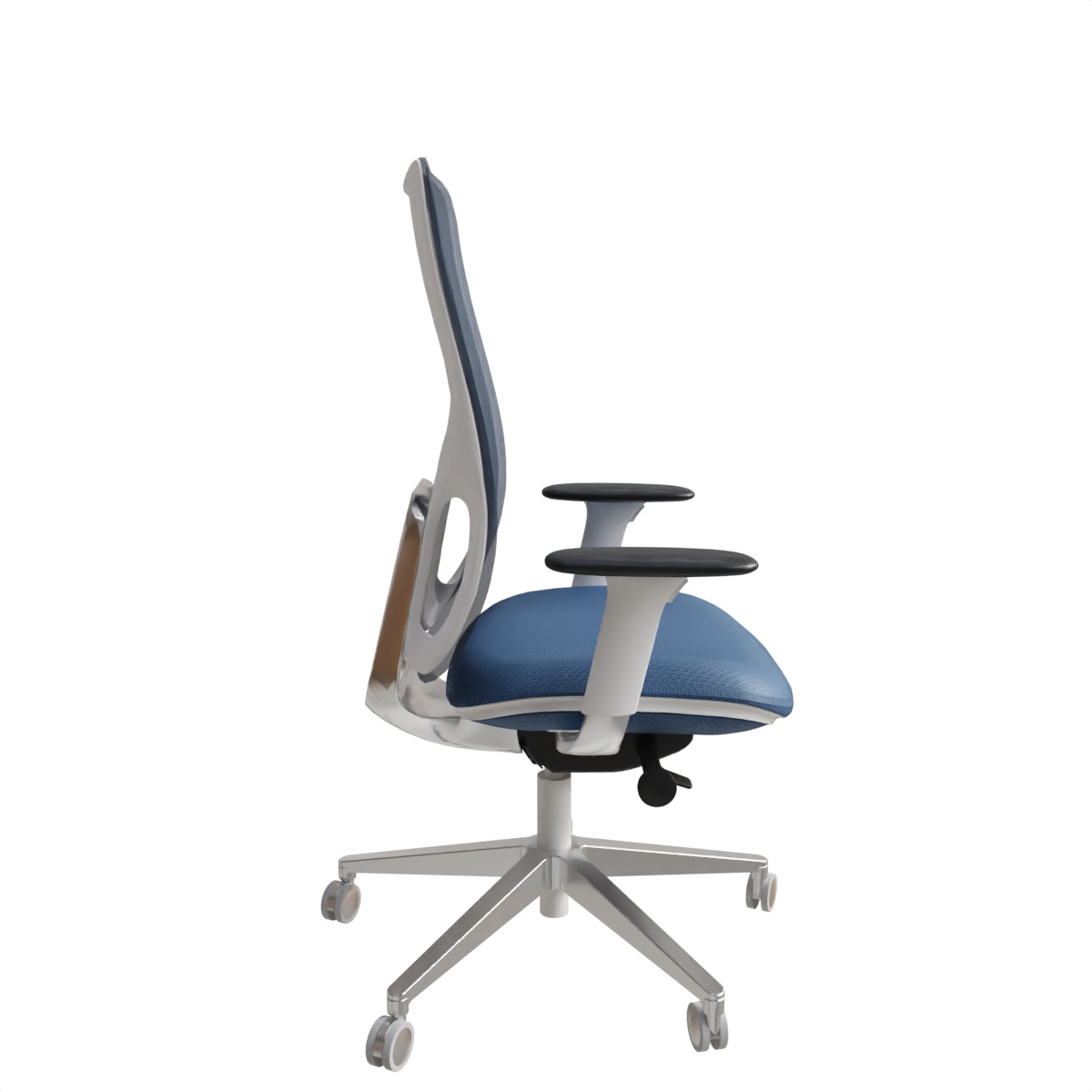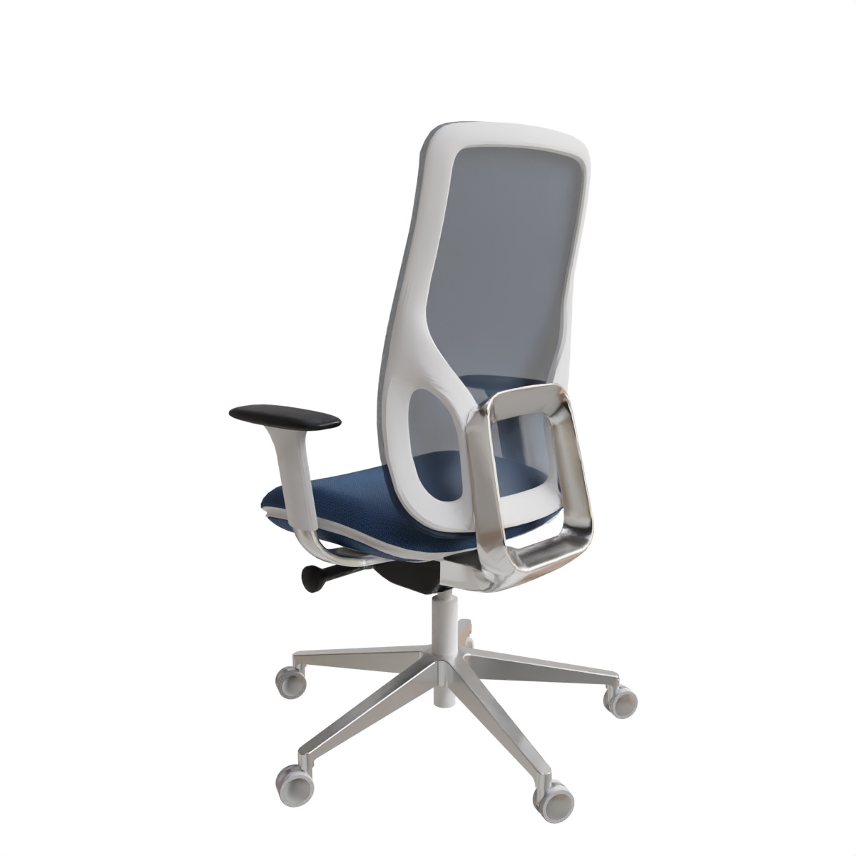 L’assise large et galbée est tapissée en série, offrant un confort d’accueil moelleux et durable. Le dossier en résille de haute qualité garantit une ventilation constante, évitant l’accumulation de chaleur. La lame assise-dossier et la base étoile à 5 branches sont en aluminium poli, conférant au fauteuil une robustesse exceptionnelle et une esthétique raffinée. Les roulettes de diamètre 65 mm sont conçues pour les sols durs, assurant une mobilité fluide et silencieuse.