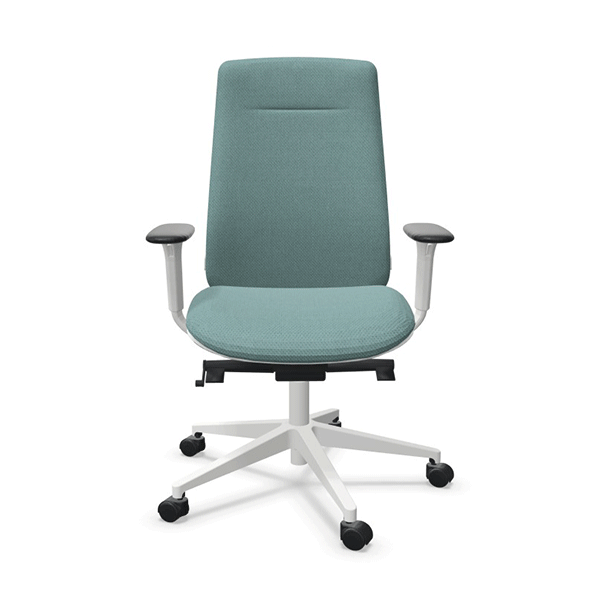 Le fauteuil Eman blanc tapissé est doté d’une pièce qui relie l’assise au dossier, s’inspirant des plis d’un ruban. Outre son esthétique agréable, cette pièce assure la liaison entre la partie supérieure et la partie inférieure du siège, dissimulant subtilement le mécanisme de réglage en hauteur du dossier. Cela confère au fauteuil une apparence rassurante et généreuse tout en maintenant un haut niveau de qualité industrielle.
