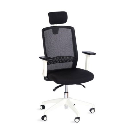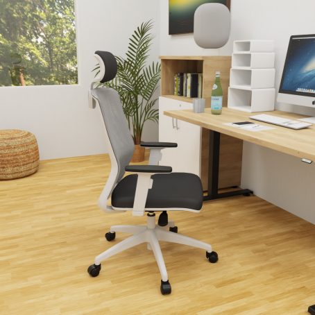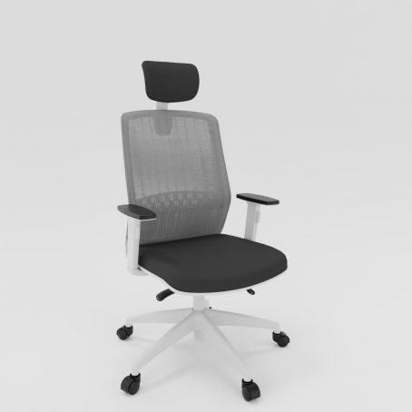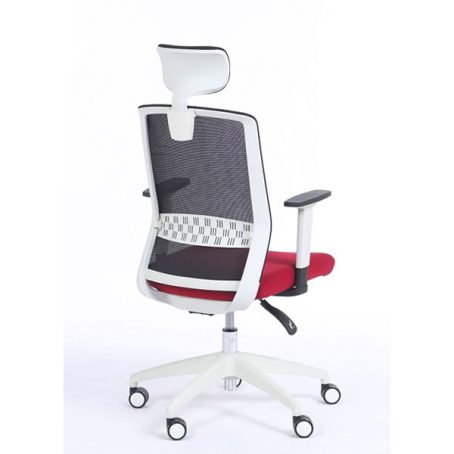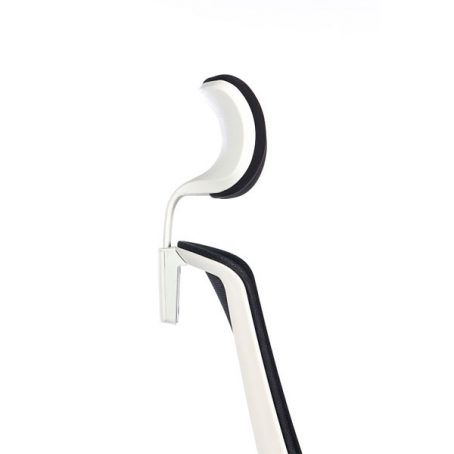 Le Scott avec têtière est un fauteuil de bureau ergonomique équipé d’une têtière tapissée noire réglable en hauteur. Le Scott, dans cette configuration, est composé d’une structure blanche. Ainsi, les accoudoirs, l’étoile à 5 branches, le soutien lombaire, la têtière et le cadran du dossier est blanc. Le mécanisme du fauteuil est de type synchrone, afin de vous garantir une bonne posture sur la chaise pendant l’utilisation. Ainsi, l’assise et le dossier bougent de manière coordonnée, vous garantissant plus d’ergonomie. Pour limiter les douleurs aux niveaux des lombaires, le Scott est équipé d’un renfort lombaire, réglable en hauteur. Le fauteuil est d’ailleurs composé d’une résille noire épousant les formes du corps de l’utilisateur. L’assise, quant à elle, est composée d’une mousse injectée d’une densité de 40kg/m3. Les accoudoirs blancs sont réglables en hauteur avec manchettes soft touch réglable en profondeur par translation. L’assise du fauteuil peut être revêtue d’un tissu, rouge, gris, noir ou bleu.