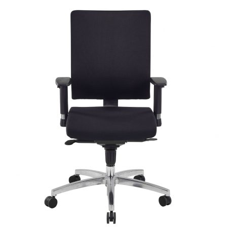 Le fauteuil Hans est disponible en noir et possède un piétement en aluminium chromé de 66 mm. Les roulettes sont noires, en polyamide double galets, et ont un diamètre de 60 mm.