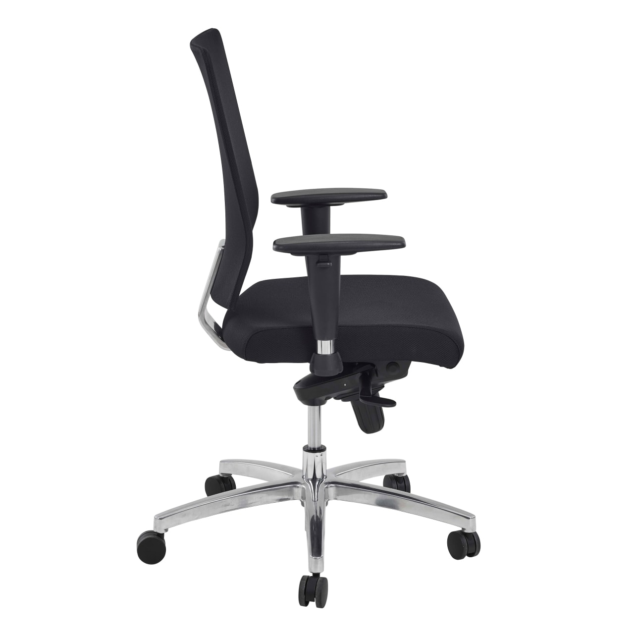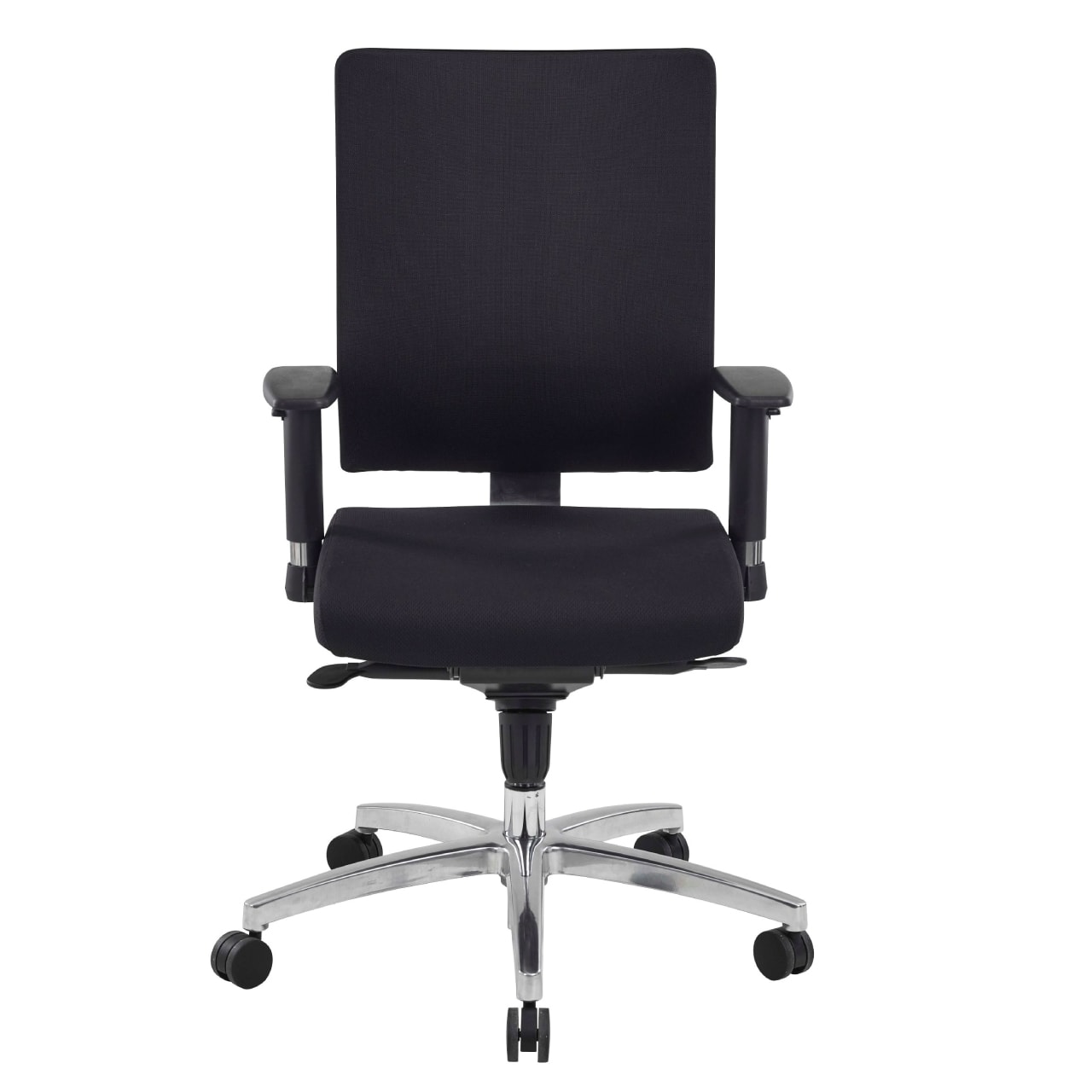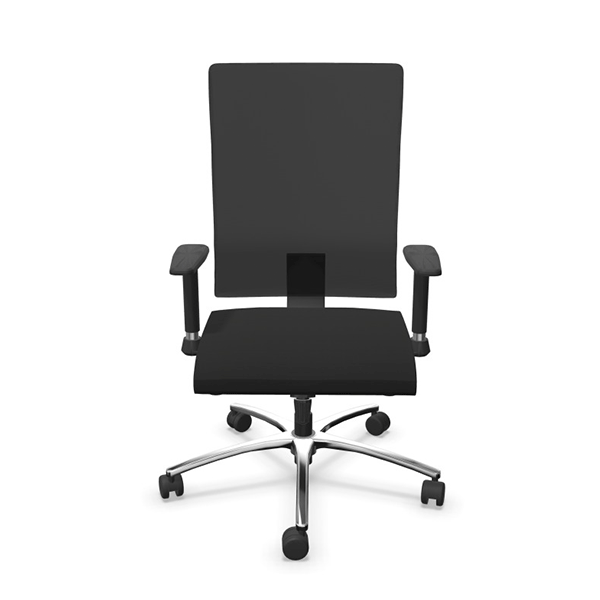 Le fauteuil Hans est disponible en noir et possède un piétement en aluminium chromé de 66 mm. Les roulettes sont noires, en polyamide double galets, et ont un diamètre de 60 mm.