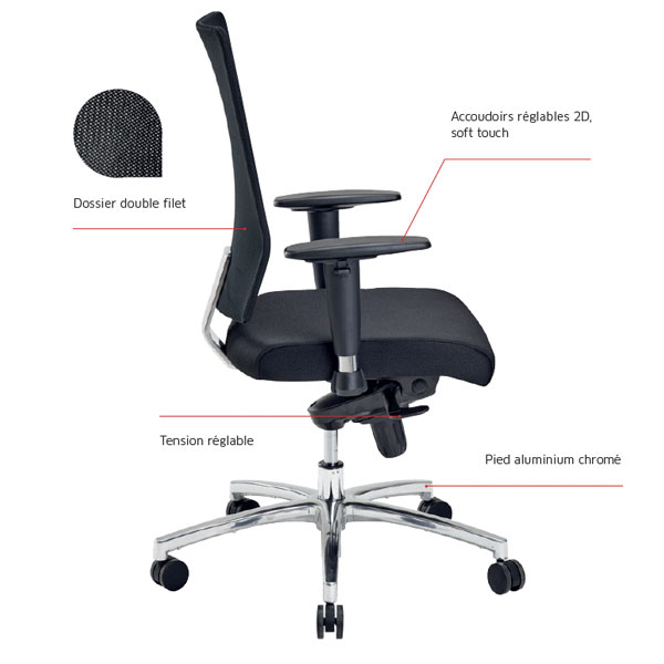 Le fauteuil Hans est équipé d’un dossier double filet qui offre un maintien de la colonne vertébrale et une meilleure circulation de l’air. Les accoudoirs réglables en 2D sont conçus pour s’adapter parfaitement à la morphologie de l’utilisateur.