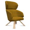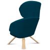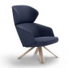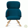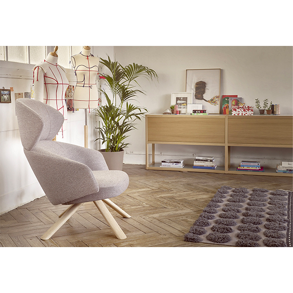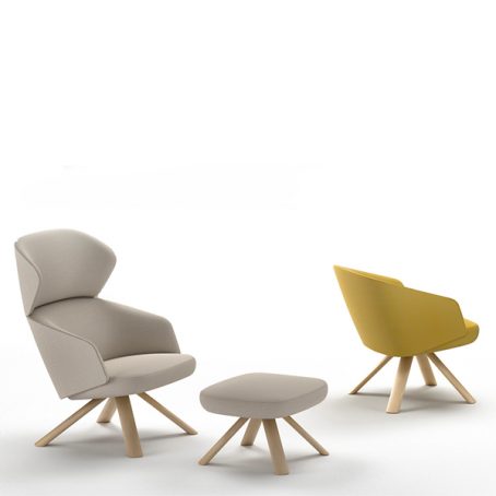 Ce fauteuil lounge se caractérise par la douceur de ses courbes et de son confort enveloppant. Son design aux dimensions généreuses invite à s’y relaxer le temps d’une pause et en font une pièce maîtresse quel que soit l’environnement dans lequel il sera placé. La forme très originale de son piétement 4 branches en chêne accentue l’aspect chaleureux et convivial de la gamme. La famille se compose d’un fauteuil haut, d’un fauteuil bas et d’un pouf repose-pieds. Coussin têtière amovible en option. Un ensemble de tables basses en chêne massif vient compléter la gamme. Disponibles en trois hauteurs et trois diamètres différents, ces tables peuvent être utilisées seules ou groupées.