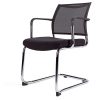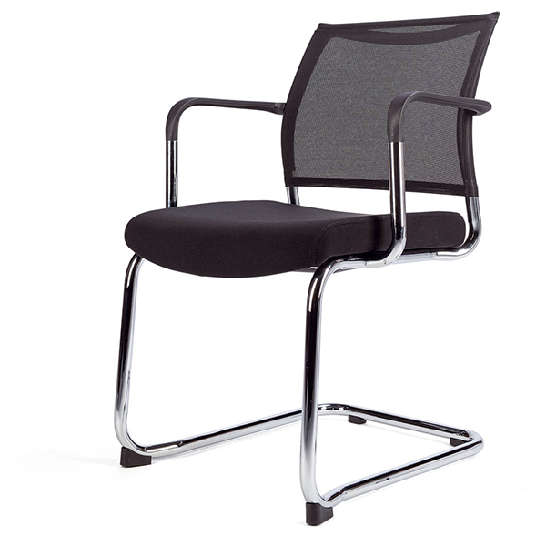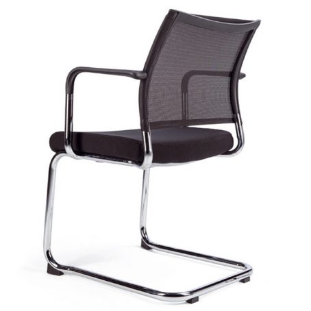 Fauteuil piètement luge avec structure chromée. Assise tapissée et dossier résille noir avec accoudoirs.