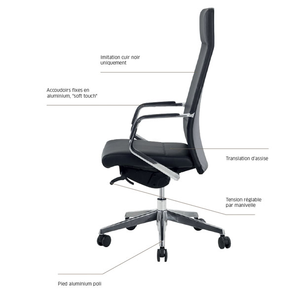 Le Fauteuil Président Simili Cuir Amory de Sitek est un fauteuil haut de gamme destiné aux utilisateurs de bureau à la recherche d’un fauteuil confortable et élégant. Son mécanisme synchrone blocable 4 positions avec réglage de tension latéral par manivelle, anti-retour, permet une assise optimale et une posture saine pour éviter les douleurs dorsales. Les accoudoirs fixes en aluminium avec manchettes « soft touch » offrent un support confortable pour les bras. Le pied en aluminium poli assure une stabilité et une durabilité accrues.
