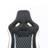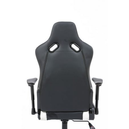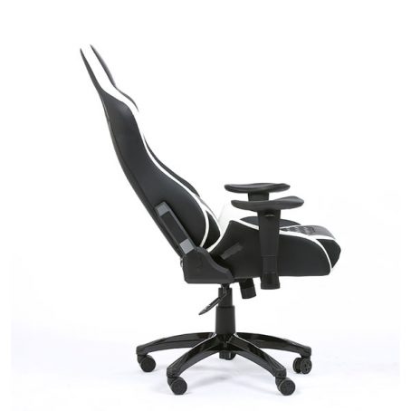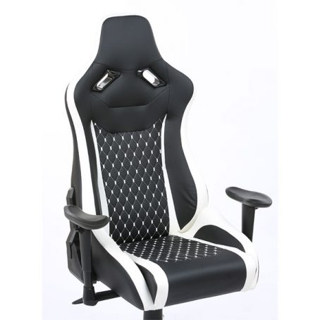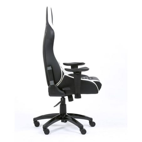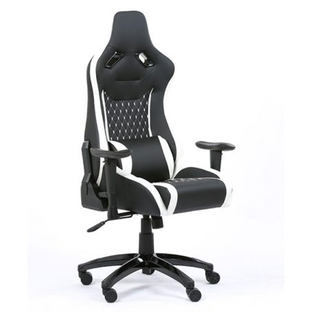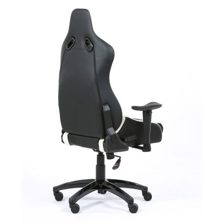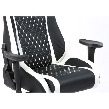 Fauteuil basculant en polyuréthane, dossier fortement inclinable, accoudoirs réglables en hauteur et pivotants, soutien lombaire en coussinet.