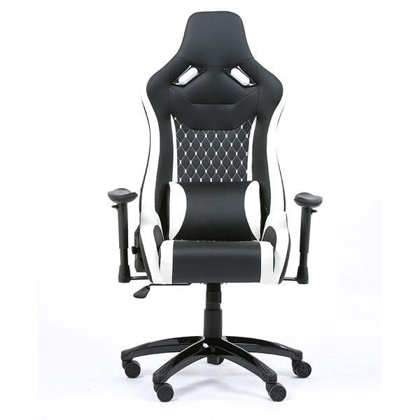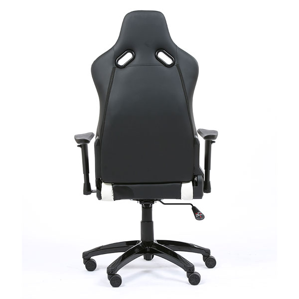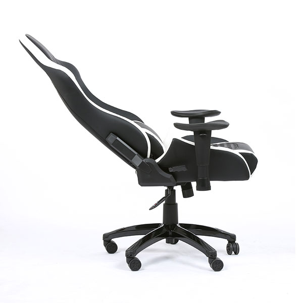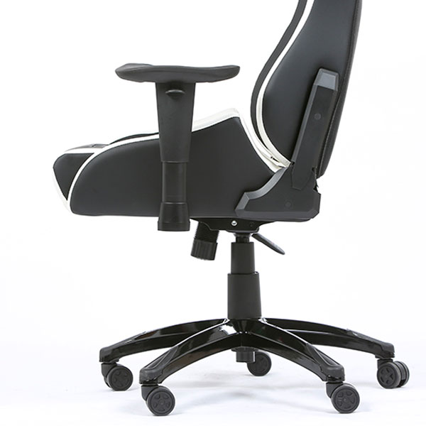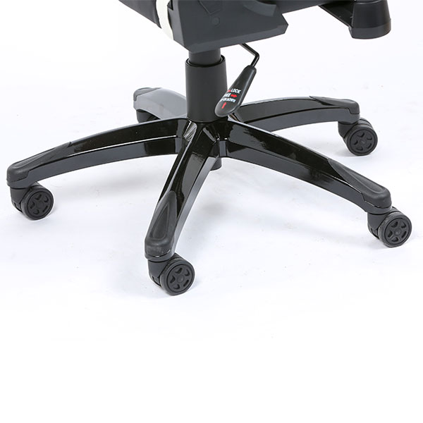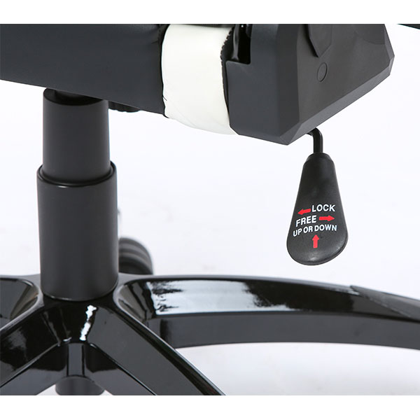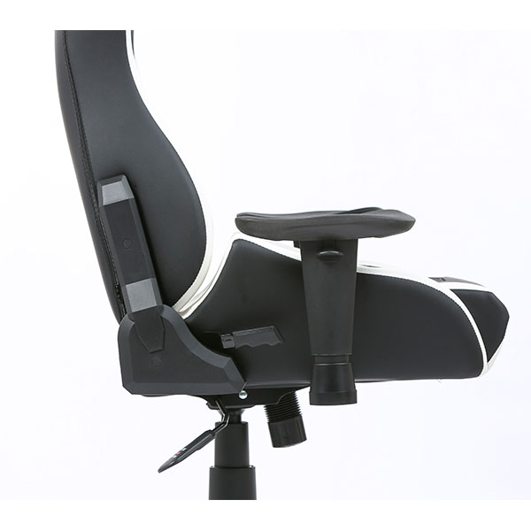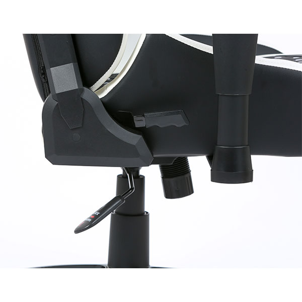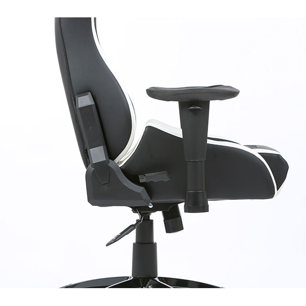 Fauteuil basculant en polyuréthane, dossier fortement inclinable, accoudoirs réglables en hauteur et pivotants, soutien lombaire en coussinet.