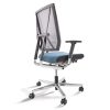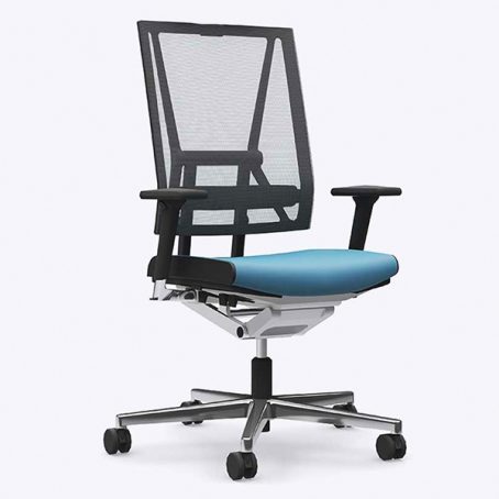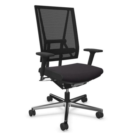 Mécanisme point synchrone 4 positions de blocage avec effet anti-retour. Réglage d’inclinaison avant de l’assise inclus. Réglage ultra rapide de la tension du dossier. Réglage de la hauteur d’assise par vérin pneumatique de sécurité. Dossier avec «système pendolo» pour une assise dynamique. Dossier en maille tendue réglable en hauteur. Assise en mousse de polyuréthane haute performance. Tissus tendus non collés. Piétement en fonte d’aluminium poli équipé de roulettes à double galets auto-freinées pour sol moquette norme EN 12529. Structure en aluminium poli, Structure en aluminium poli, composants polyamide et polypropylène anthracites. Assise avec passepoil (bordure latérale) cuir noir ST610.