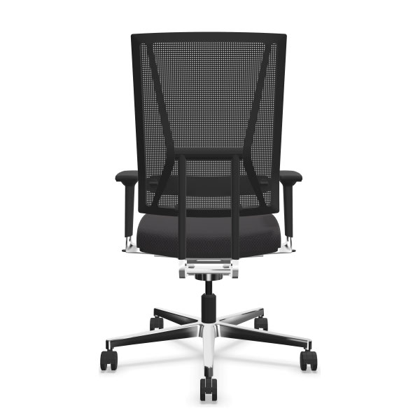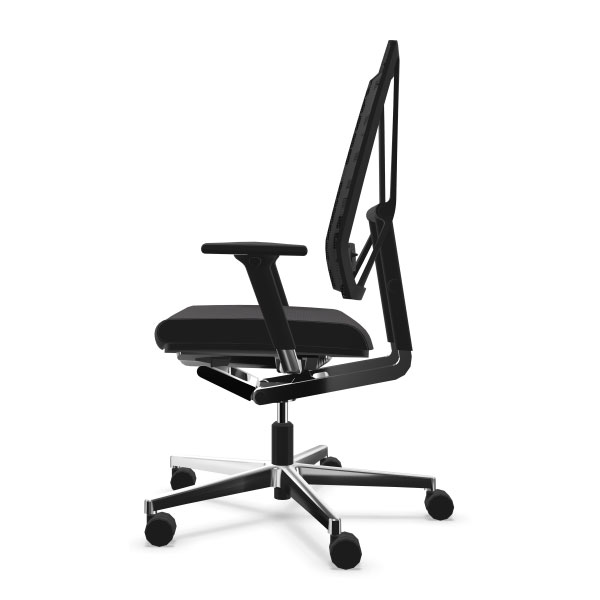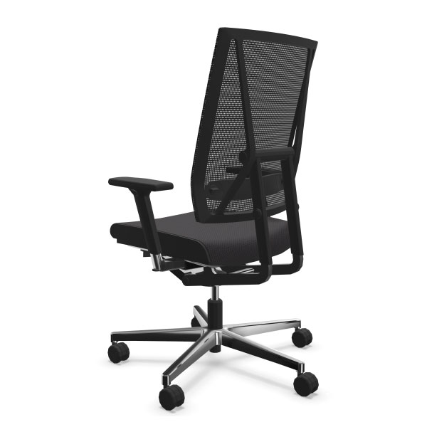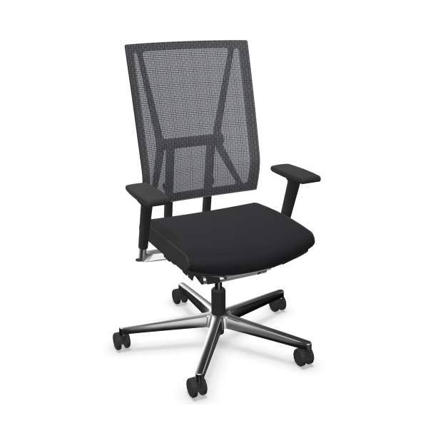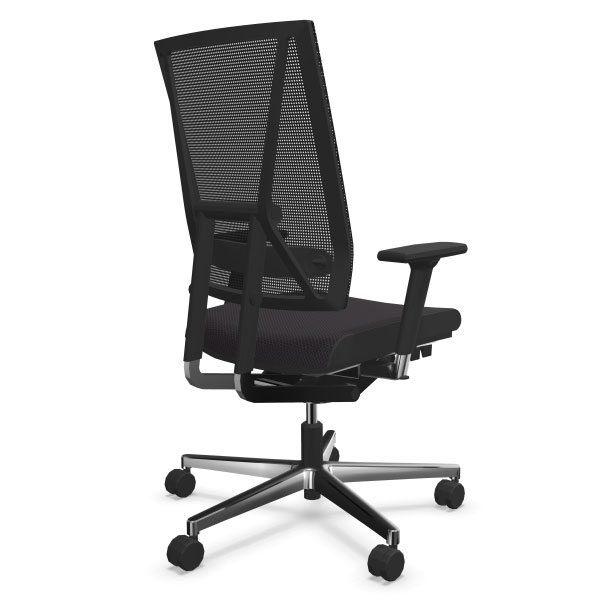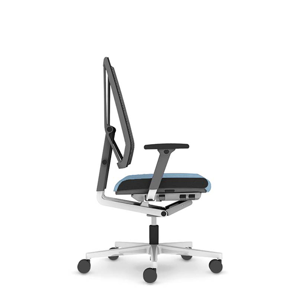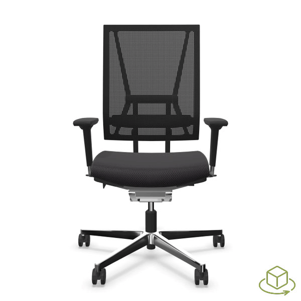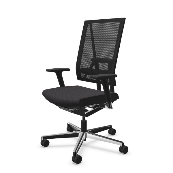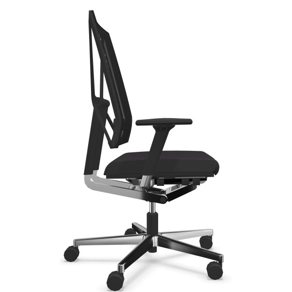 Mécanisme point synchrone 4 positions de blocage avec effet anti-retour. Réglage d’inclinaison avant de l’assise inclus. Réglage ultra rapide de la tension du dossier. Réglage de la hauteur d’assise par vérin pneumatique de sécurité. Dossier avec «système pendolo» pour une assise dynamique. Dossier en maille tendue réglable en hauteur. Assise en mousse de polyuréthane haute performance. Tissus tendus non collés. Piétement en fonte d’aluminium poli équipé de roulettes à double galets auto-freinées pour sol moquette norme EN 12529. Structure en aluminium poli, Structure en aluminium poli, composants polyamide et polypropylène anthracites. Assise avec passepoil (bordure latérale) cuir noir ST610.