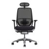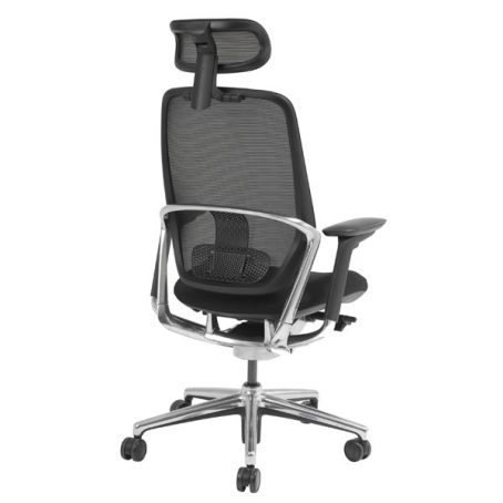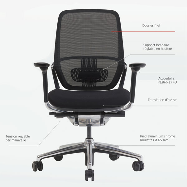 Le mécanisme de ce fauteuil est un système synchrone, blocable sur 1 position avec une course maximale de 30°, avec 3 positions de réglage du basculement. Il est équipé d’une manette pour le blocage/déblocage du dossier et d’une autre pour le réglage de la hauteur d’assise par vérin à gaz autoporteur. Le réglage en profondeur de l’assise se fait par un système coulissant à ressort avec une course de 50 mm, et le soutien lombaire est réglable avec une course de 70 mm. Les accoudoirs sont réglables en hauteur par gâchette avec une course de 90 mm, et la manchette est réglable en profondeur avec une course de 50 mm, ainsi qu’en largeur de 35 mm. Les supports d’accoudoirs sont en aluminium poli.