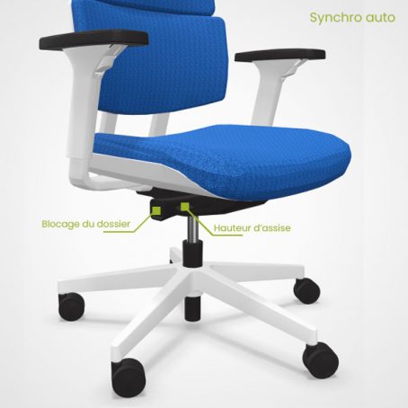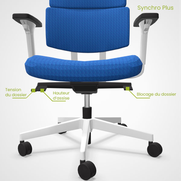Synchro Flex : Mécanisme synchrone permettant une inclinaison positive de l’assise. Option conseillée pour les personnes cherchant une position de travail avancée type assis-debout.