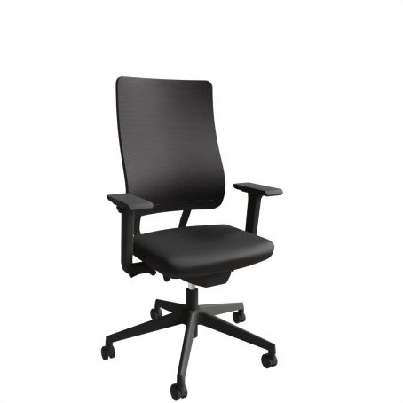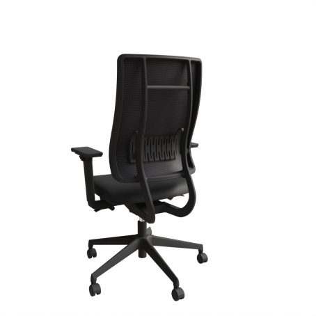 Le modèle Newback All Black est entièrement conçu avec des éléments de couleur noire, y compris le cadre du dossier et les pièces en matière synthétique, le piétement et les roulettes.