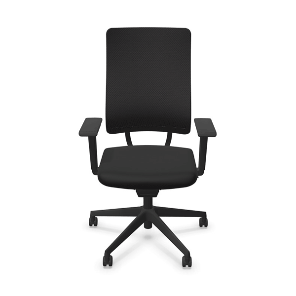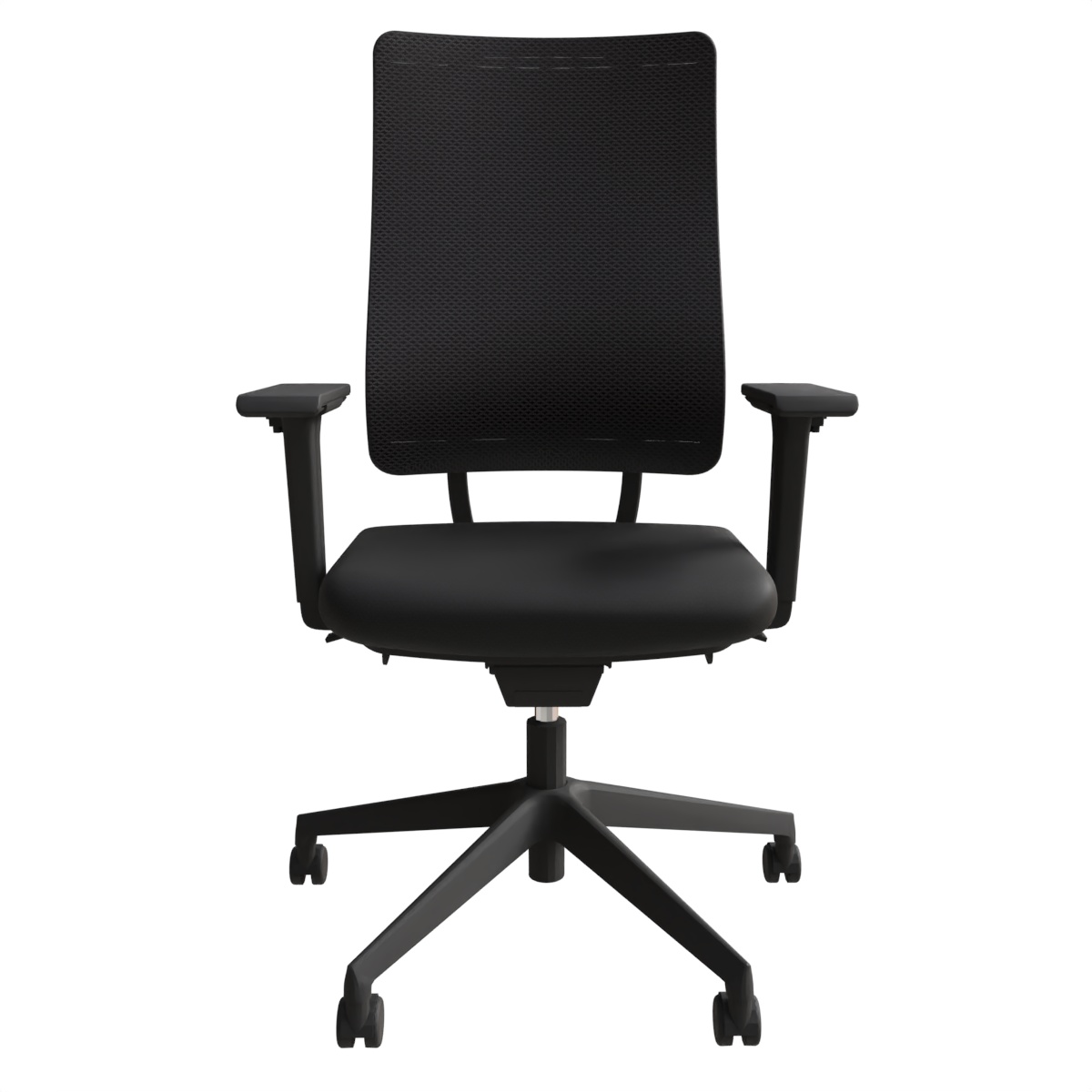Le modèle Newback All Black est entièrement conçu avec des éléments de couleur noire, y compris le cadre du dossier et les pièces en matière synthétique, le piétement et les roulettes.