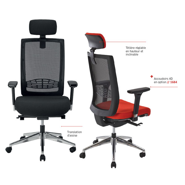 Le fauteuil Yvan avec têtière dispose d’une assise tiroir avec translation pour s’adapter aux différentes morphologies. La mousse de l’assise, sans CFC et de densité 40 kg/m3, offre un confort optimal avec une épaisseur de 65 mm. Le soutien lombaire flex et la têtière réglable en hauteur et inclinable permettent de personnaliser le confort du fauteuil. Le dossier en tissu maille 100% polyester offre une haute résistance et une bonne ventilation.