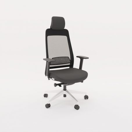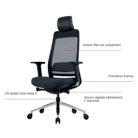 Ce fauteuil bureautique synchrone blocable sur 5 positions est doté d’un mécanisme synchrone Donati, d’un système anti-retour et réglable en 7 intensités différentes suivant le poids de l’utilisateur. Il dispose également d’un support lombaire réglable et d’une têtière réglable en hauteur en imitation cuir noir de 17 cm. Les accoudoirs 4D réglables en hauteur, profondeur et latéralement vers l’intérieur et l’extérieur sont munis de manchettes soft touch.