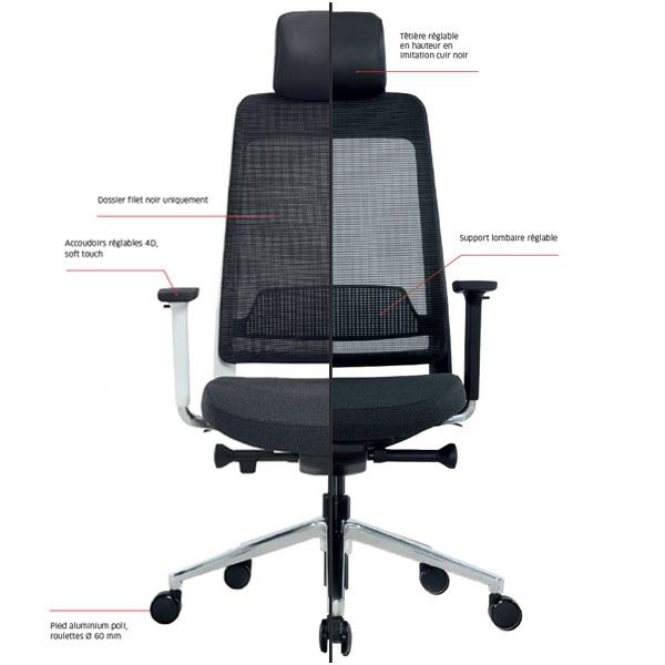 Ce fauteuil bureautique synchrone blocable sur 5 positions est doté d’un mécanisme synchrone Donati, d’un système anti-retour et réglable en 7 intensités différentes suivant le poids de l’utilisateur. Il dispose également d’un support lombaire réglable et d’une têtière réglable en hauteur en imitation cuir noir de 17 cm. Les accoudoirs 4D réglables en hauteur, profondeur et latéralement vers l’intérieur et l’extérieur sont munis de manchettes soft touch.