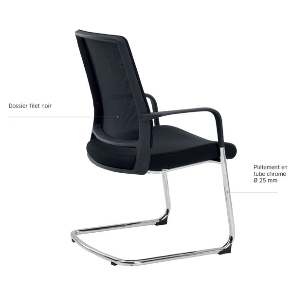 L’assise est constituée d’un support en polypropylène injecté noir et d’une mousse de polyuréthane de densité 40 kg/m3, garantissant un confort d’assise optimal pour vos invités, même pendant de longues périodes. Le dossier en filet tendu sur cadre en polypropylène noir assure quant à lui une excellente aération pour un confort optimal.