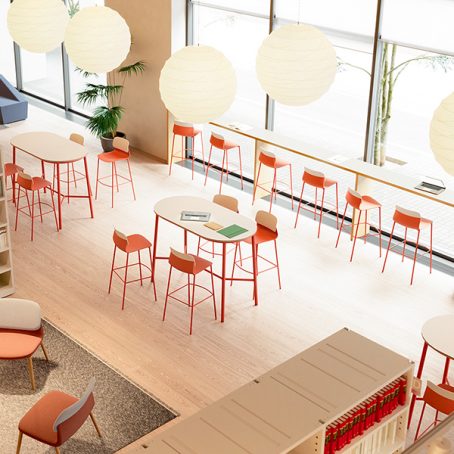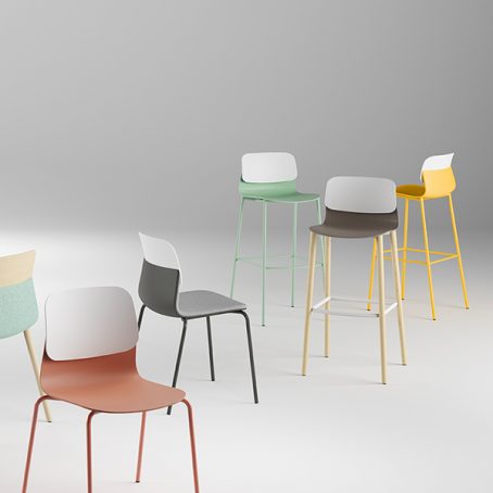 “Originale et élégante, la gamme Klik propose une famille de chaises, tabourets et chauffeuses pieds bois ou pieds métal pouvant aménager à elle seule les espaces de bureau, cafétéria, restaurants et lounge les plus raffinés avec une personnalité unique. Succombez au charme et à l’universalité de cette chaise et choisissez votre combinaison personnalisée parmi ses multiples matériaux et coloris. Fixé sur l’assise, le dossier procure une certaine souplesse dans le soutien dorsal pour un confort optimal de l’utilisateur.”