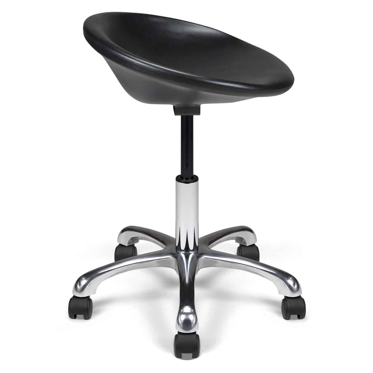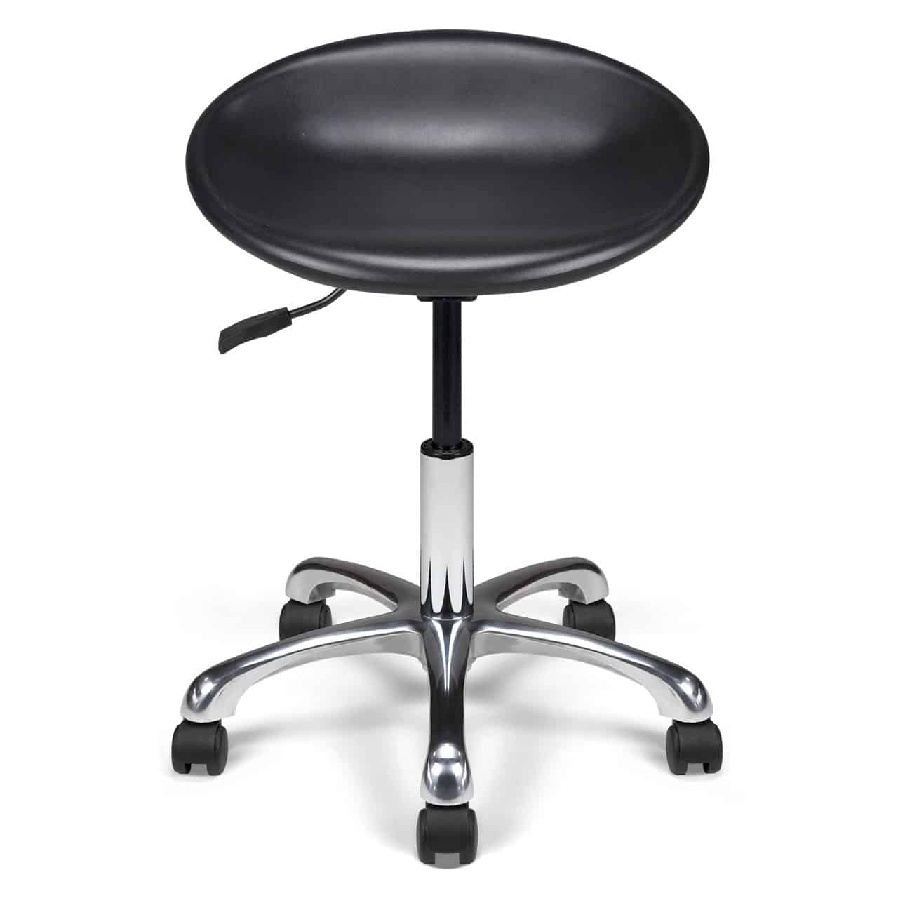 Vérin pneumatique lg 305 mm – différentes longueurs possibles, nous consulter. Assise polyuréthane noir haute densité. Base aluminium poli, diam. 540 mm.